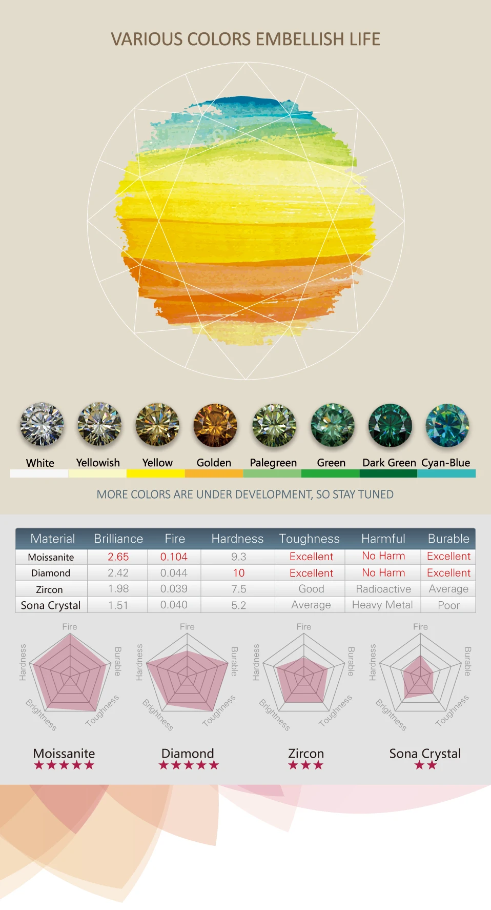 В 1904 году д-р Анри Муассан раскрыл минерал в кратере метеоритов в Аризоне. Он изготовлен из космоса и имеет почти такую же твердость и яркость, как алмазы, произведенные естественным образом на земле. Сегодня мы смогли использовать высокие технологии для создания этого великолепного драгоценного камня, который позволяет большему количеству людей носить этот вид ювелирных изделий, который является доступным и не только бриллиантом-красивым и вечным. Мы производим наиболее полный спектр синтетических алмазов, C V D, HPHT и муассанита в различных цветах и инкрустация в различных видах ювелирных изделий более десяти лет.