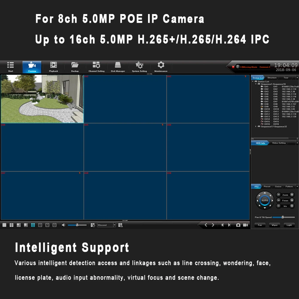 3. Поддержка ONVIF2.6, Highprofile S, Highprofile G и может быть подключена к сетевым камерам, которые соответствуют стандартам ONVIF, RTSP, сделанным многими крупными производителями.