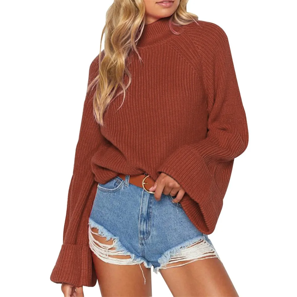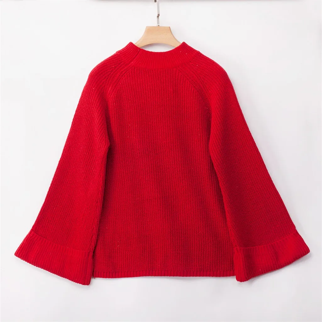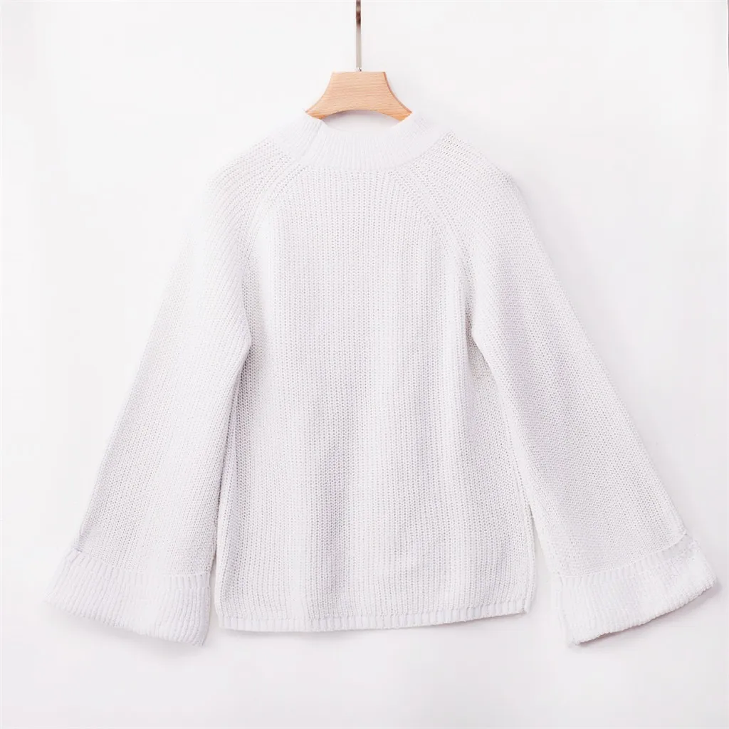 Pullover Plus Size Women Knitted Solid Bell Sleeve Solid O-Neck Sweater Blouse