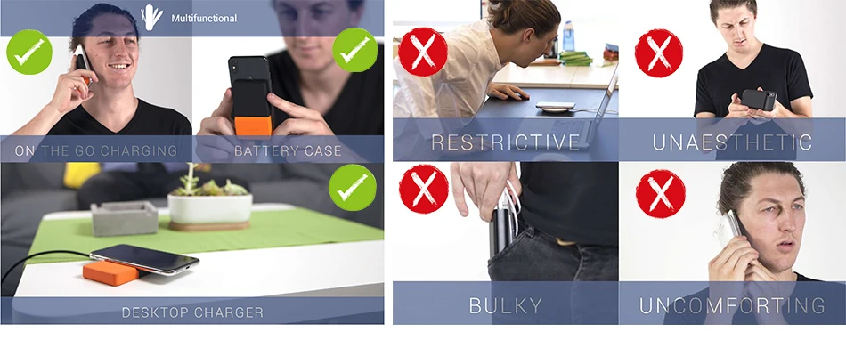 Два кирпича автоматически намагничивают, когда они закрываются, а затем просто приклеиваются к телефону, чтобы обеспечить питание в любое время в любом месте. Один кирпичный блок питания поставляется с функцией беспроводного зарядного устройства, банка питания и чехол-батарея для телефона.