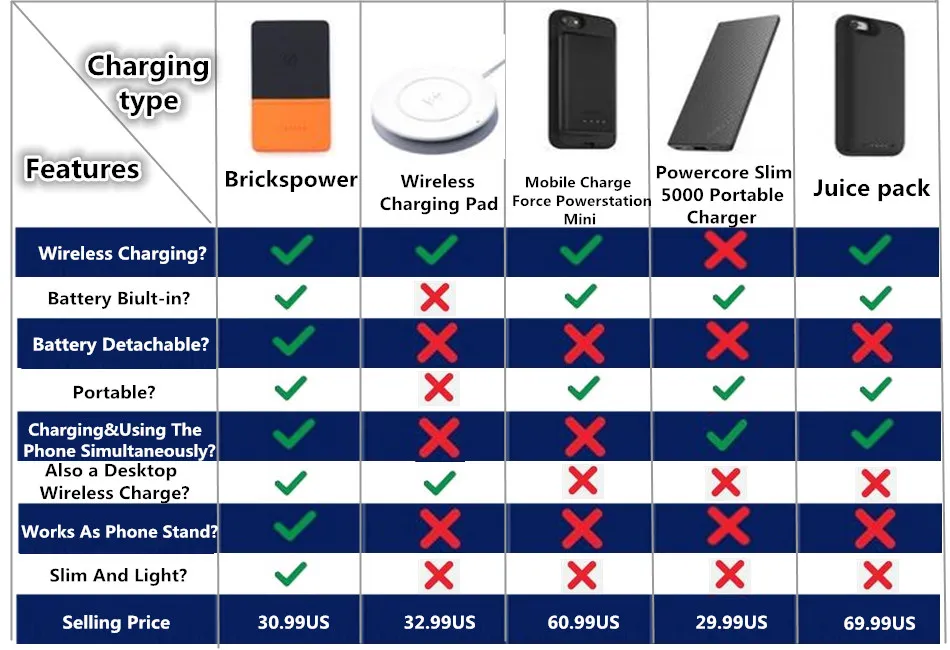 1.Brickspower состоит из батареи и зарядки 2. Емкость аккумулятора составляет 3000 мАч, который можно использовать для зарядки iphone XS один раз. 3. Имеют сертификацию Qi/fcc/ce/RoHs/UN38.3/msds/PSE сертификацию 4. Интегрированная защита контроля температуры, интеллектуальный контроль зарядки, для предотвращения перегрева или сбоя цепи, и продлевает срок службы аккумулятора мобильного телефона. 5.Brickspower может поддерживать мобильные телефоны с чехлом мобильного телефона: (1) Поддержка большинства гладких/глянцевых мобильных телефонов (толщина не более 3 мм, рекомендуется использовать внешний стеклянный корпус). Нет необходимости разбирать чехол для телефона при зарядке. (2) не подходит для кожаных/выпуклых и вогнутых/зернистых поверхностей/металлического чехла для телефона