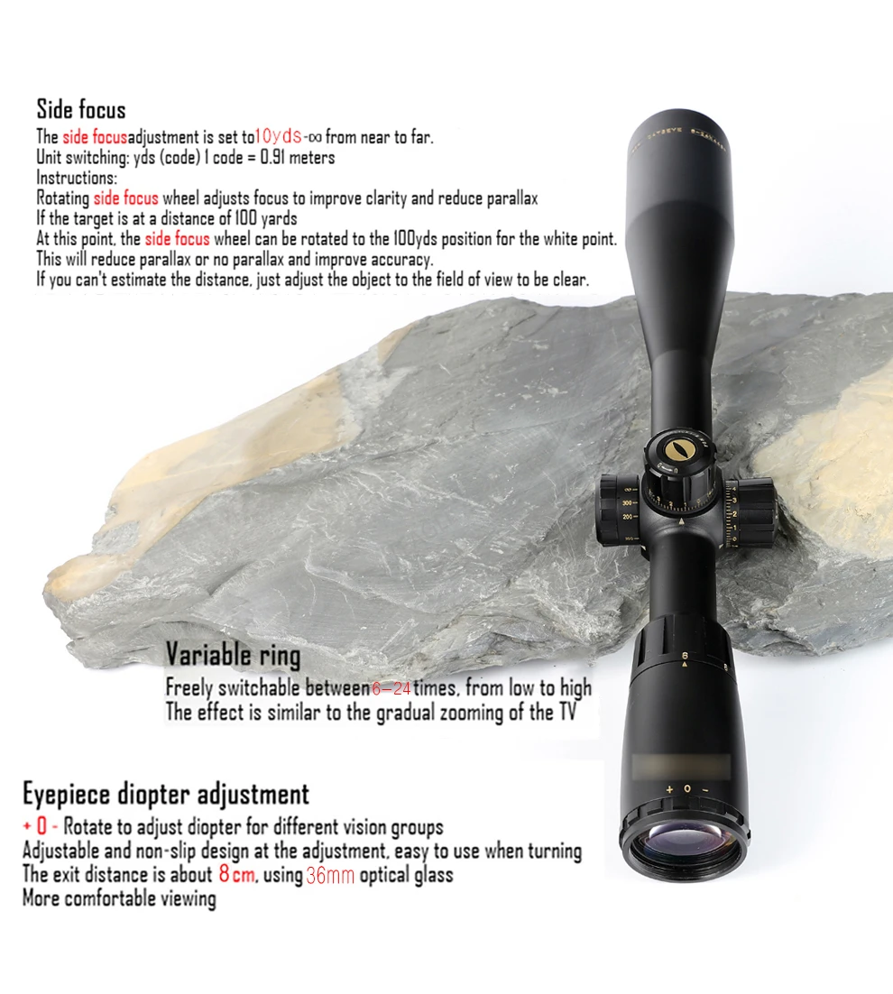 Модель продукта: CAT 6-24X44SP Увеличение: 6-24X Фокусное расстояние: во-вторых Цвет: черный Диаметр трубки: 25,4 мм Вес: 629 г Длина: 390 мм Объектив объектива: 44 мм Глазные линзы: 32 мм Параллакса окружающая Обстановка: 100YDS Регулировка параллакса: боковой Фокус Метод параллакса: растягивающийся замок Подсветка: нет Водонепроницаемость: Да Противоударный: Да