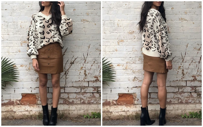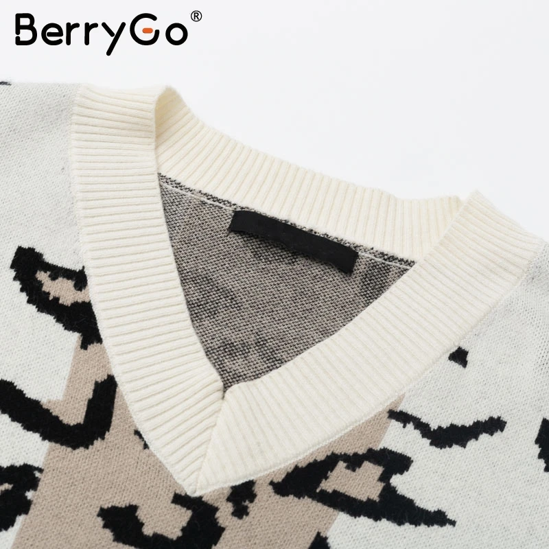 BerryGo Leopard print knitted sweater women Autumn winter female casual pullover V neck lantern sleeve streetwear ladies jumpers