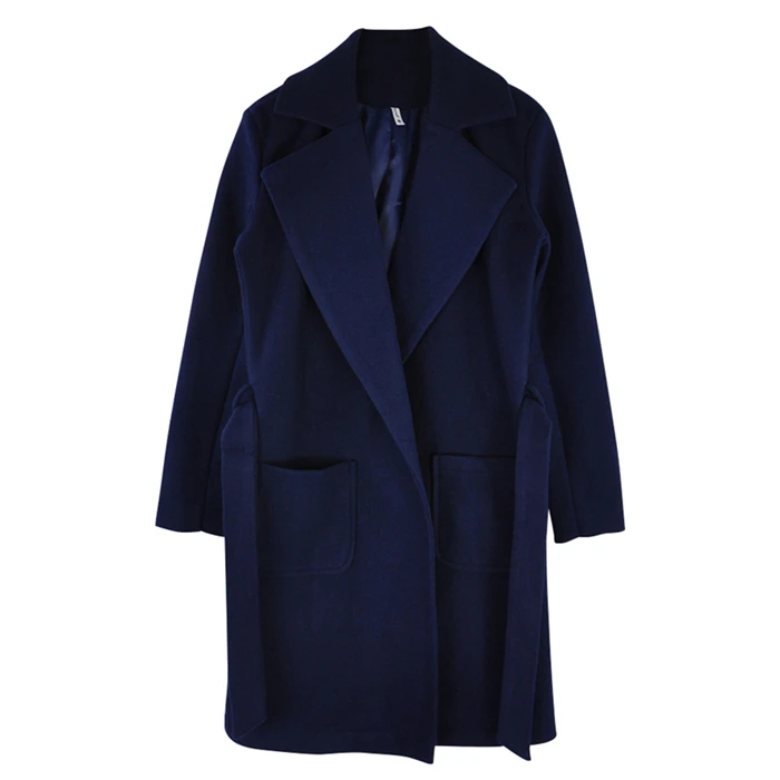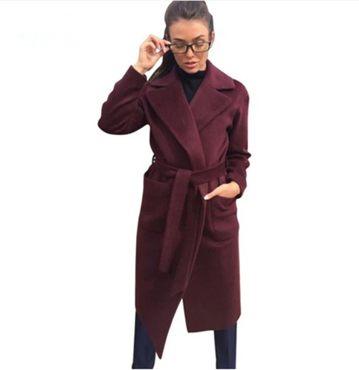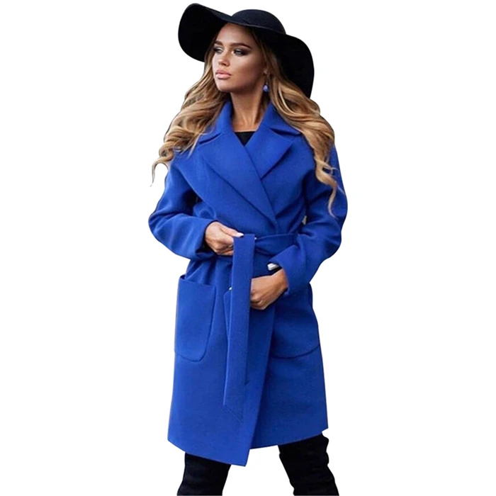 Элегантное длинное женское пальто с отворотом, 2 кармана, жакеты с ремешком, одноцветные пальто, женская верхняя одежда, женское осеннее зимнее теплое пальто