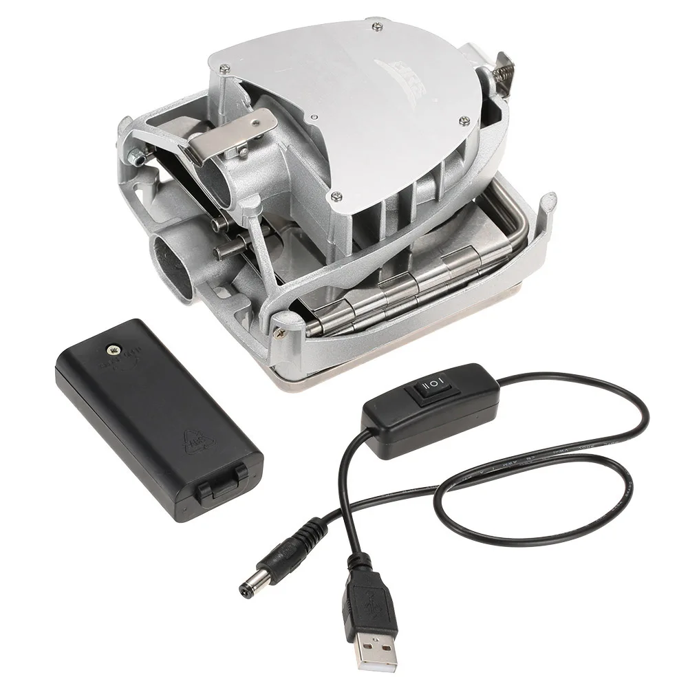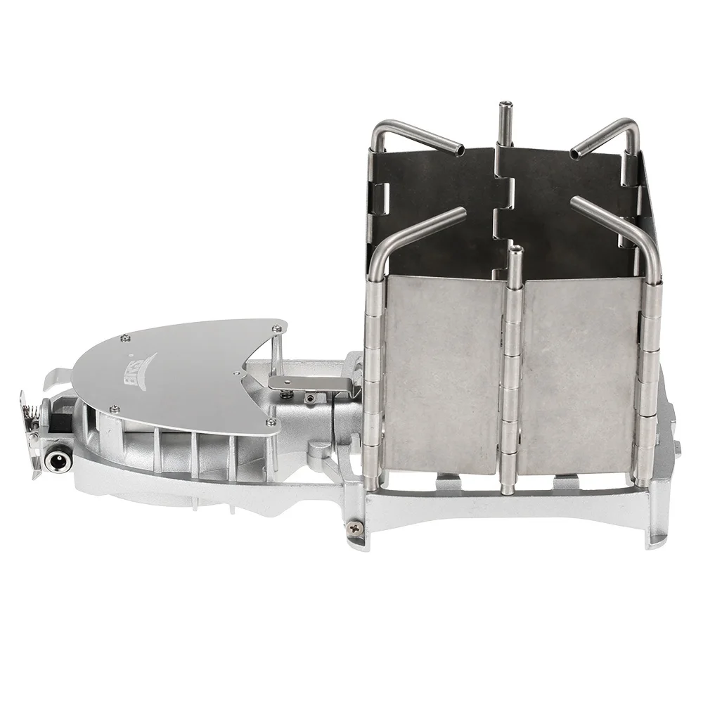 Эта плита имеет уникальный дизайн вентилятора, который питается от 2 батареек AA или мобильного источника питания (оба не включены). Выключатель питания имеет уровень двух траншей для изменения огневой мощи. Воздуходувка также имеет заслонку, и, регулируя размер дроссельной заслонки, размер пламени может быть точно настроен. Обеспечение кислородом пламени воздуходувкой, значительно улучшает интенсивность пламени, так что эффективность сгорания выше.