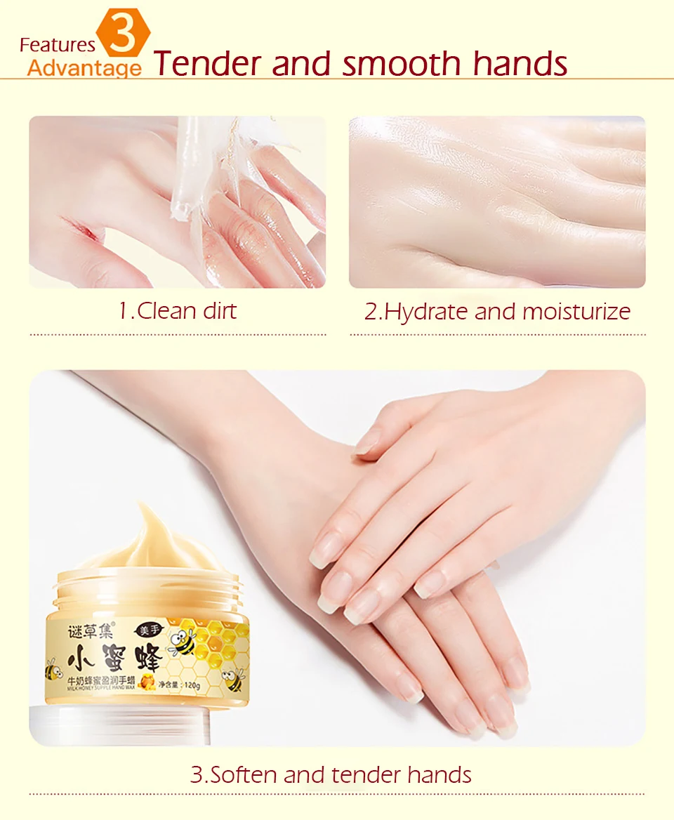 【Product name】: Micaoji Milk Honey Nourishing Handwax 【Specification】: 120g 【Main ingredients】: glycerine, petrolatum, shea butter, horse fat, tocopherol,beewax,etc. 【Product features】: soften cutin, peel off the cutin of the surface of skin, relieve dull and coarse skin and improve the tenderness and brightness of skin. 【Skin type】: suitable for multiple skin types