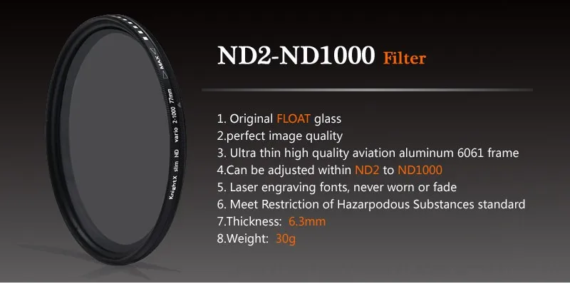 ND2-ND1000 Фильтры нейтральной плотности (ND) помогают снизить интенсивность света без существенного изменения его цвета. Классические фильтры нейтральной плотности имеют различные показатели сокращения диафрагмы объектива и коэффициент пропускания, следовательно они могут применяться в различных условиях съёмки, Такие как Портретные картины, водопады, фонтан и т. Д.