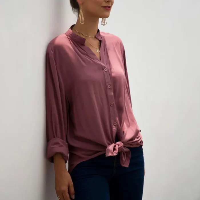 Женская рубашка с v-образным вырезом и разрезом на спине, Однотонная рубашка с длинными рукавами на бретелях, топы FDC99