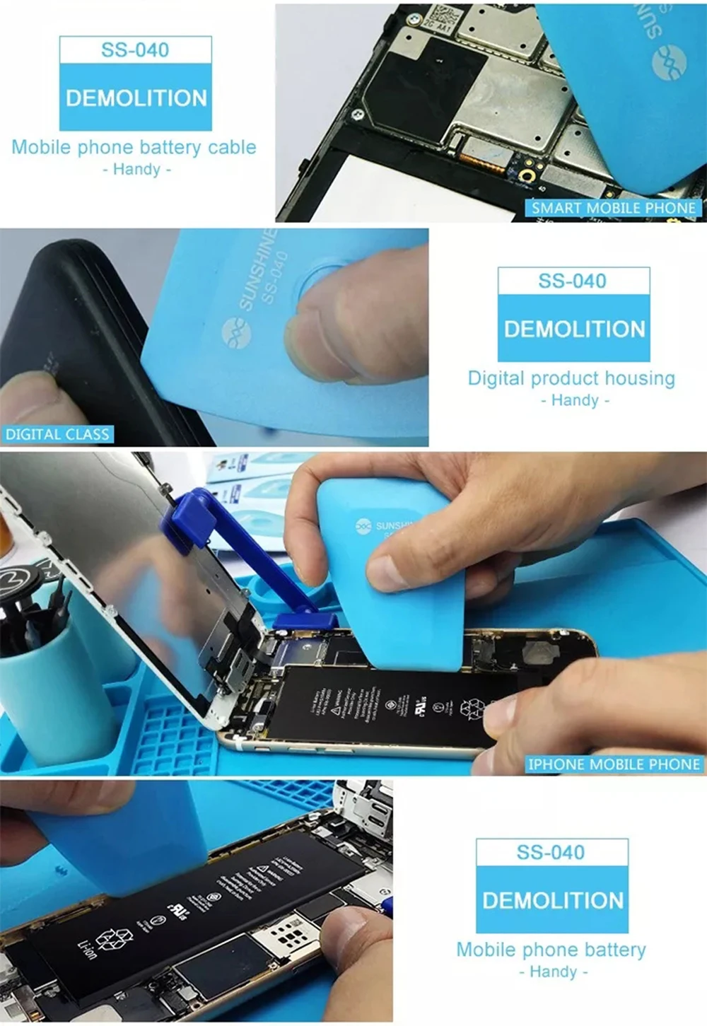 Описание: SUNSHINE SS-040 Анти-статический дизассемблер Используется для Мобильный телефон для разделения экрана, мобильный телефон кабель для удаления, мобильный телефон для удаления батареи и т. д. Четырехугольный изогнутый дизайн, чтобы удовлетворить потребности различных разборки ситуациях Края с тонкой и 0,50 мм, легко разобрать Non-slip отпечатков пальцев дизайн, легко захватывают у вас под рукой Изготовлен из импортного сырье, прочнее, чем обычное отверстие таблетки Наиболее подходящий размер для снятия мобильный телефон. Замечательный опыт пользователей.