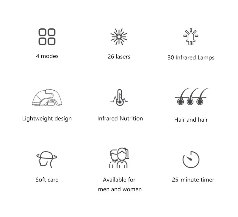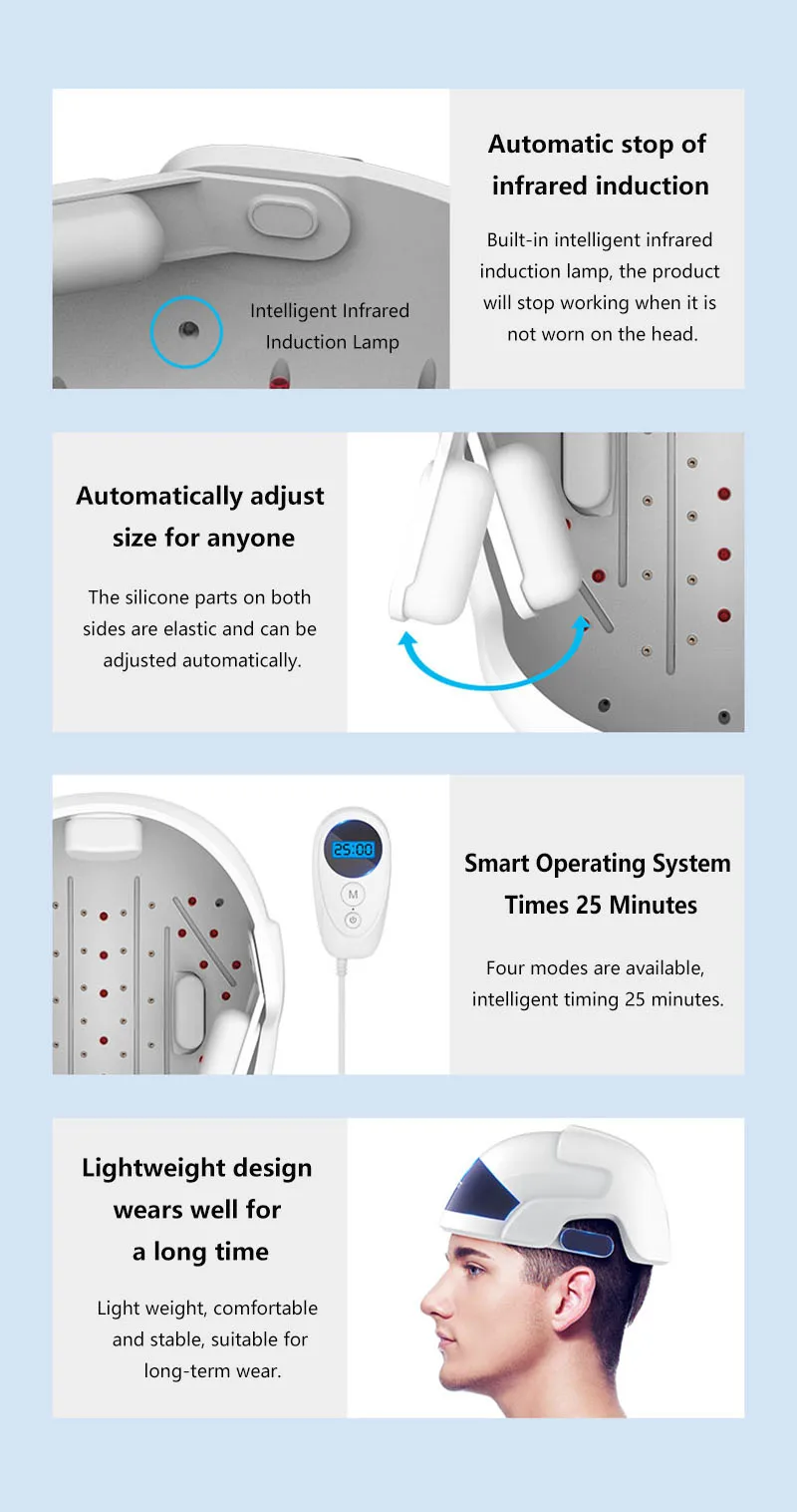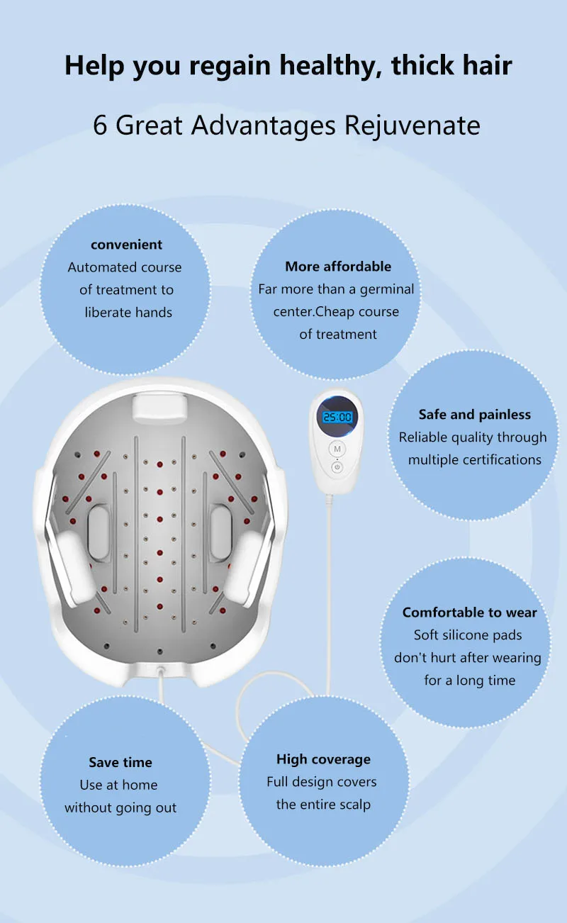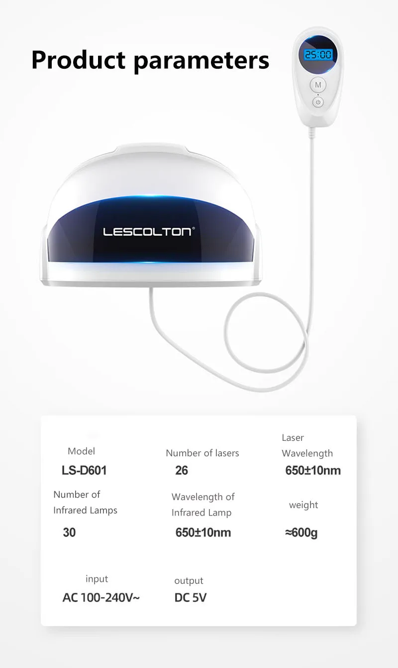 Принцип LLLT прорастания Endre meste, пионер в лазерной медицине, обнаружен в экспериментах, что красный свет определенного спектра может сделать атрофические волосяные фолликулы здоровыми, тем самым стимулируя волосяные фолликулы и рост волос. Функция: 1,650 нм для волосяного фолликула Удельный спектр красного света 650-670 нм, в сочетании с лазером LLLT низкой энергии прямого облучения в волосяную фолликулу, может усиливать волосяной фолликуль и, таким образом, рост волос. 2. Интеллектуальный инфракрасный лазерный генератор Стимулирует ослабленные волосяные фолликулы безболезненным образом, укрепляет жизненную силу фолликулов и способствует здоровому росту волос. 3. Лазер LLLT + светодиодный инфракрасный свет Новая Универсальная схема обслуживания волосяных фолликулов Низкоэнергетический лазер и инфракрасный свет двойной технологии, инъекция здоровой энергии из корня для кожи головы, непосредственно в корень волос, чтобы пробуждать волосяной фолликул, волосяного фолликула здоровья, здоровья волос. 4. Высокая плотность энергии 56 источников света LLLT лазер низкой энергии длина волны 650±10 нм Инфракрасная длина волны светодиодный 650±10 нм 5. Интеллектуальная функция памяти Функция обновления памяти, последний режим использования по умолчанию на следующей загрузке Характеристики продукта: 1. Инфракрасная индукция, автоматическая остановка Встроенная интеллектуальная инфракрасная Индукционная лампа, продукт перестанет работать, когда он не носится на голове. 2. Автоматически регулировать размер для любого человека Силиконовые детали с обеих сторон эластичны и могут регулироваться автоматически. 3. Интеллектуальная операционная система, синхронизация 25 минут Четыре режима являются дополнительными. С умным переключением 25 минут. 4. Легкий дизайн, длинная одежда не устала Легкий вес, удобный и устойчивый, подходит для длительного ношения. Четыре режима Модель 1 Группа лазерных ламп и группа инфракрасных ламп одновременно Модель 2 Лидер группы лазерных ламп включен, и группа инфракрасных ламп мигает. Режим 3 Группа лазерных ламп мерцает и группа инфракрасных ламп лидер включается Режим 4 Одновременное мигание лазерных и инфракрасных световых комплектов Параметры продукта: Модель: LS-D601 Количество Лазеров: 26 Длина волны лазера: 650±10 нм Количество инфракрасного света: 30 Длина волны инфракрасной лампы: 650±10 нм Вес: 600 г Вход: 100-240 В Выход: DC5VЯ обожаю такие скраб мочалки, когда в баню ходишь,надо обязательно брать. Потому что омертвевшие клетки надо убирать с такой мочалкой,... Читать отзыв полностью...