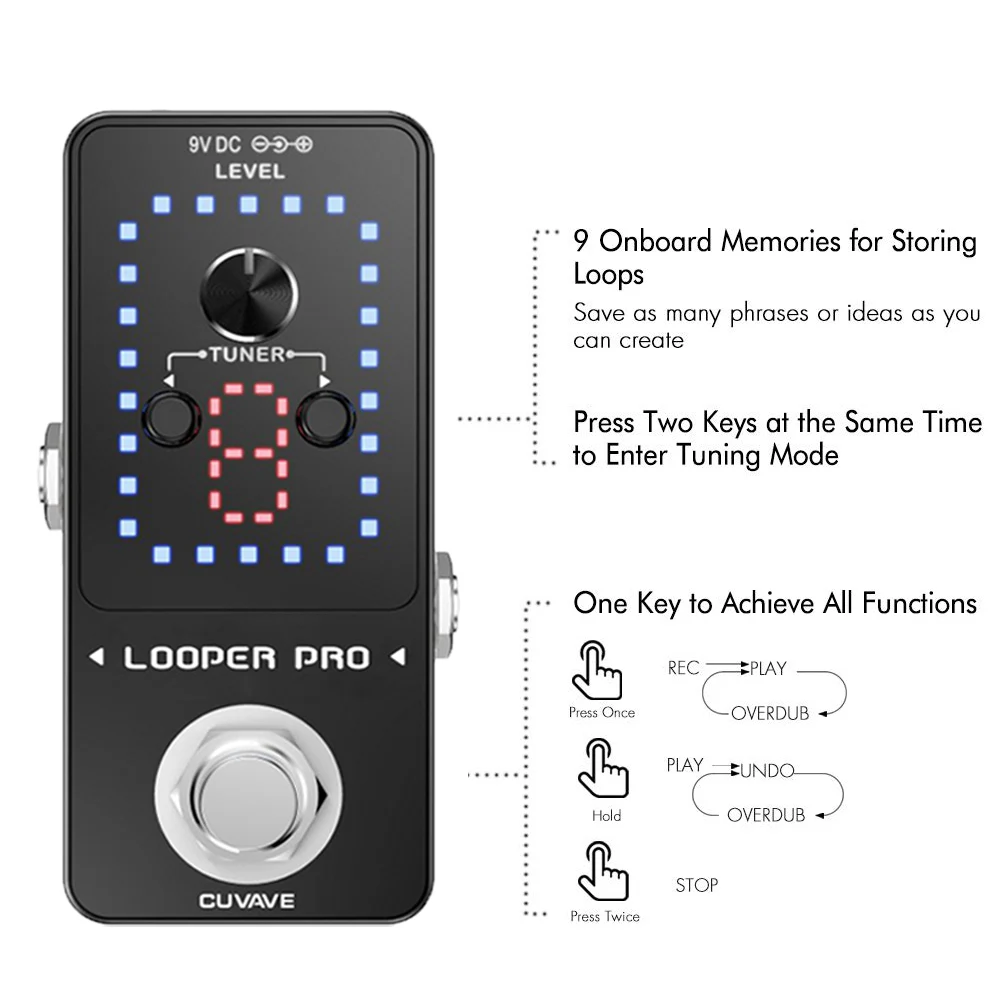 CUVAVE LOOPER PRO Guitar Loop Pedal 9 Loops Total 40 Minutes Recording Time Unlimited Overdubs Built-in Tuner Function LED Display