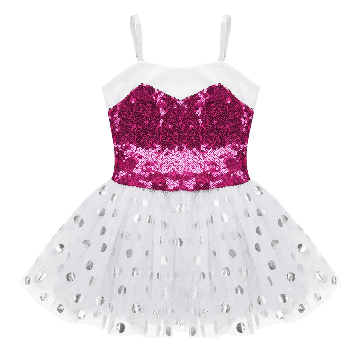 Трехслойная сетчатая юбка прилегает к талии. Верхний сетчатый слой украшен фольгой печатных горошек. Красивая Одежда для танцев для вашей девочки.