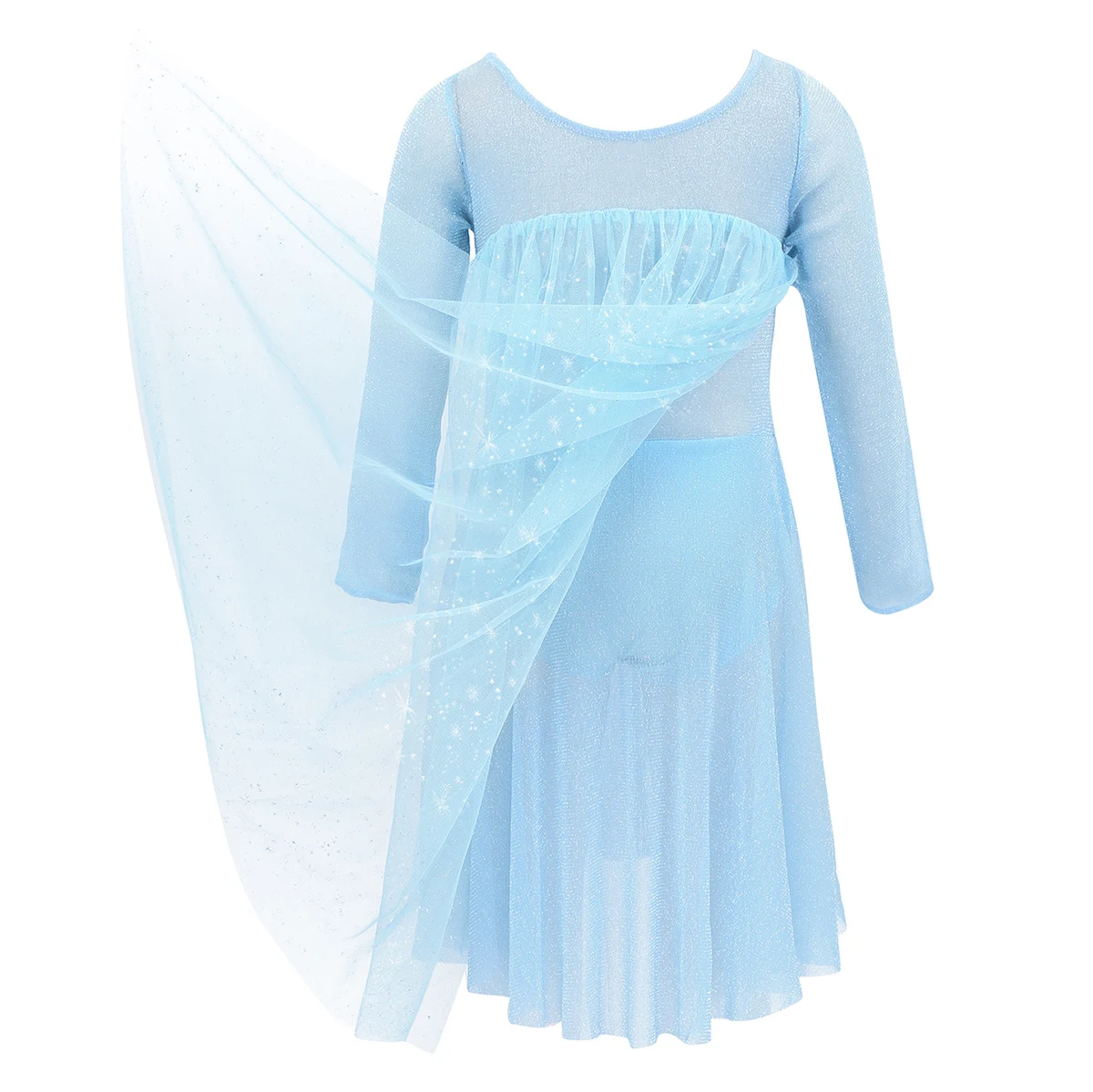 Сзади прикреплена сетчатая накидка с рисунком блестящей снежинки. Красивая Одежда для танцев для вашей девочки.