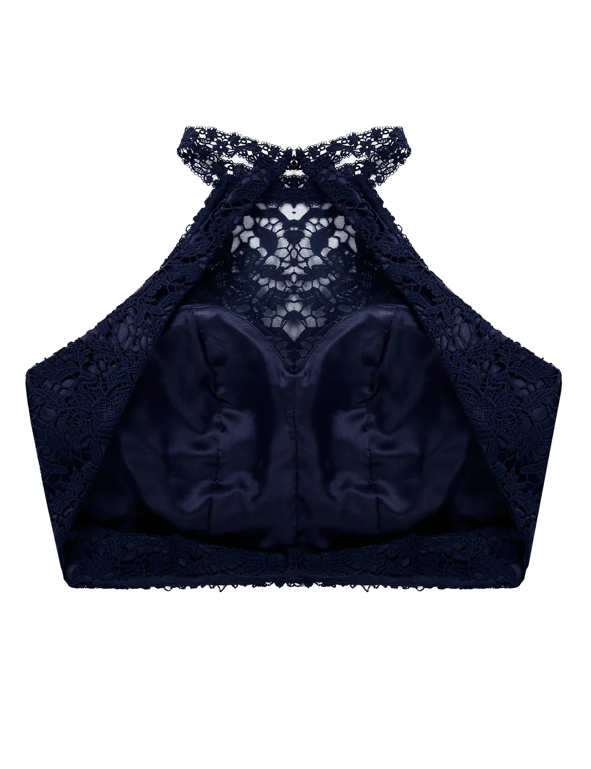 Halter neck design, sleeveless and backless with an inside clasp to fix on, fully lace overlayed top bodice with built-in-bra.