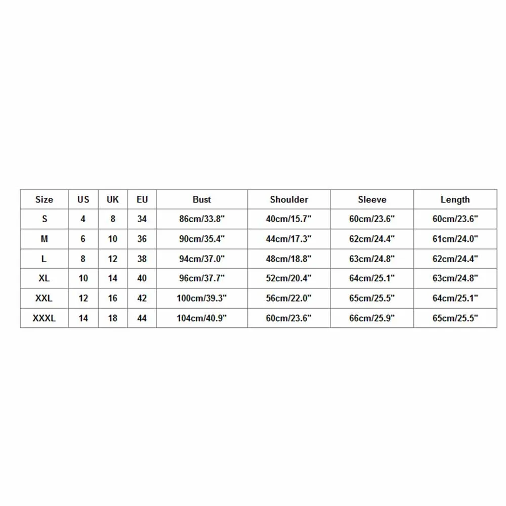 Размер Свяжитесь с нами Великобритания ЕС Обхват груди Сумка на плечо Рукава Длина S 4 8 34 86 см/33,8" 40 см/15,7" 60 см/23,6" 60 см/23,6" М 6 10 36 90 см/35,4" 44 см/17,3" 62 см/24,4" 61 см/24,0" L 8 12 38 94 см/37,0" 48 см/18,8" 63 см/24,8" 62 см/24,4" XL 10 14 40 96 см/37,7" 52 см/20,4" Высота голенища 64 см/25,1" 63 см/24,8" XXL 12 16 42 100 см/39,3" 56 см/22,0" 65 см/25,5" Высота голенища 64 см/25,1" XХХL 14 18 44 104 см/40,9" 60 см/23,6" 66 см/25,9" 65 см/25,5"