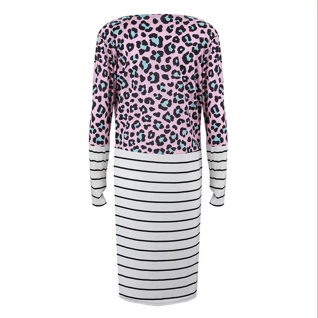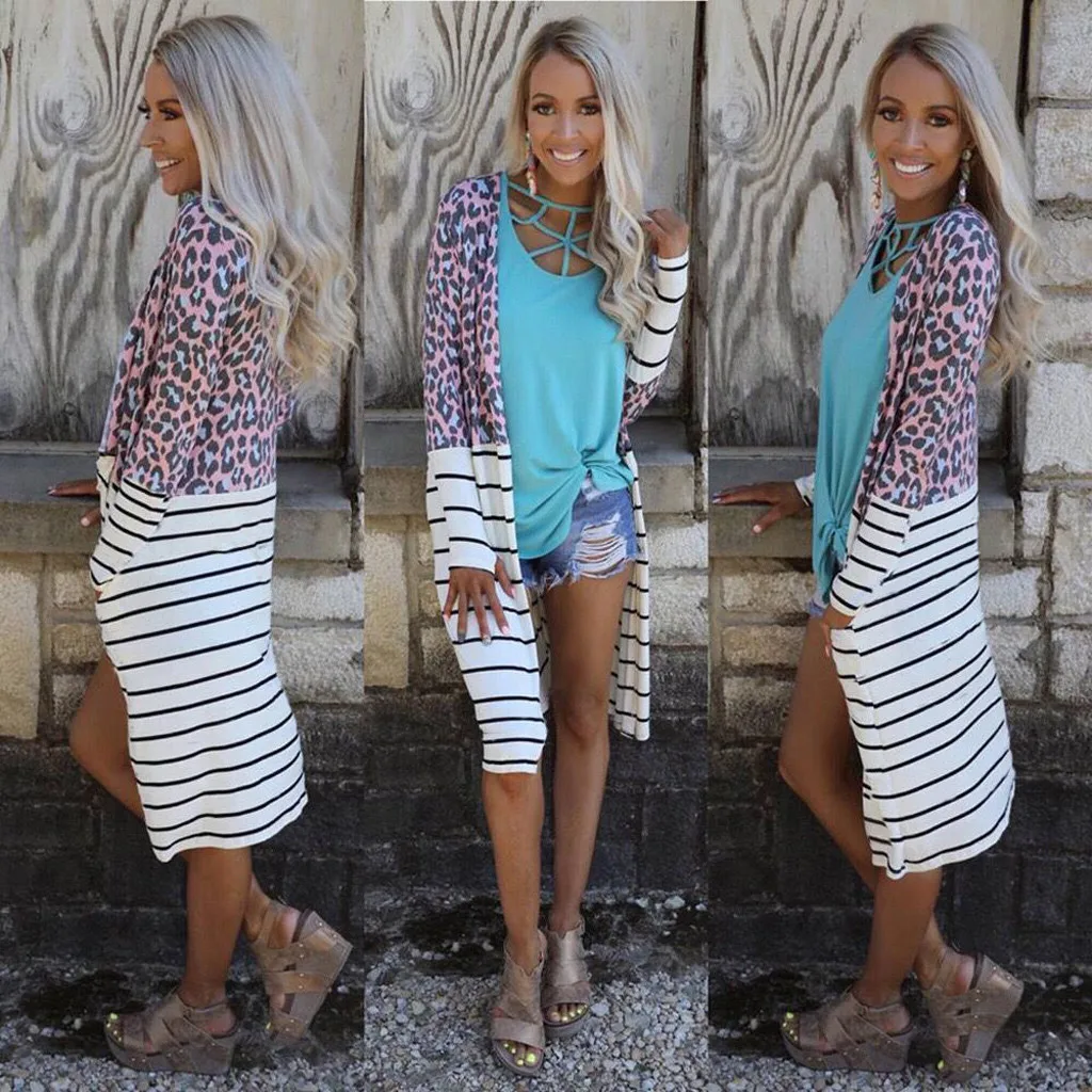 Womens Long Sleeves Leopard Print Stripe Splicing Cardigan Blouse Easy Tops
