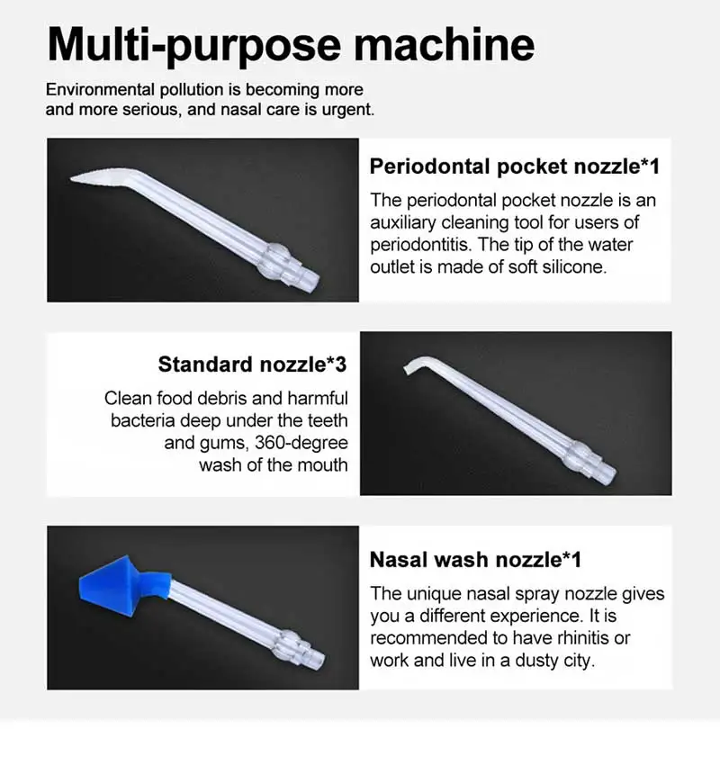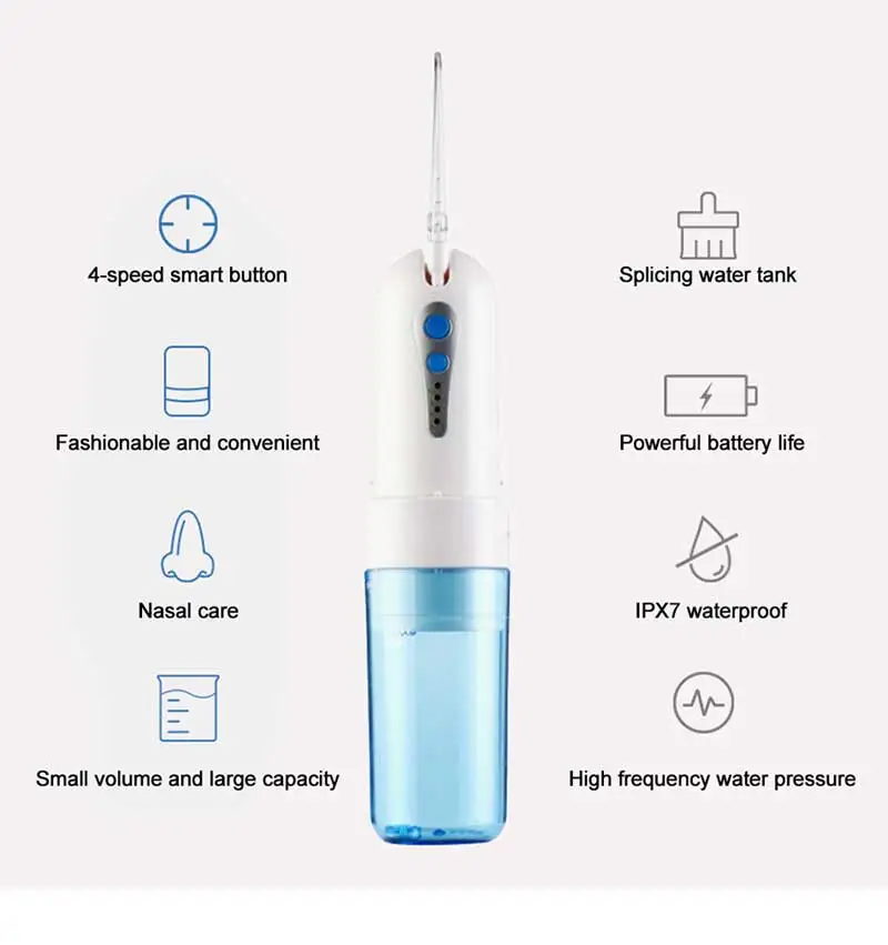 Параметры -Метод зарядки: зарядка через USB -Напряжение зарядки: 100-240 В -Емкость водного резервуара: 200 мл -Давление воды: 40-120 PSI -Частота импульса: 1200 ударов/мин -4 режима работы: нормальный и мягкий и пульс $ Sinus -Батарея: перезаряжаемая литиевая батарея 2000 мАч Посылка включает в себя -1 х основная машина -5 х сменные насадки -1 х USB кабель -Руководство пользователя-1 шт.;