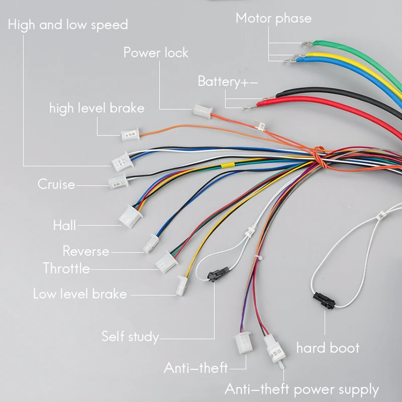 1. Подключите провод фазы двигателя, провод батареи, провод блокировки электропитания, провод Холла и самообучающийся провод. 2. Включите батарею и блокировку питания, затем двигатель может работать (если двигатель работает противоположно, пожалуйста, отрежьте самообучающийся провод, после того, как двигатель прекратит работу, затем подключите самообучающийся провод. После работы 10 секунд, отрежьте самообучающийся провод, выключите блокировку питания. Подождите около 10 секунд, перезагрузите, затем двигатель можно использовать для работы) 3. Если вы хотите использовать другие функции контроллера, вы можете подключить функциональный провод
