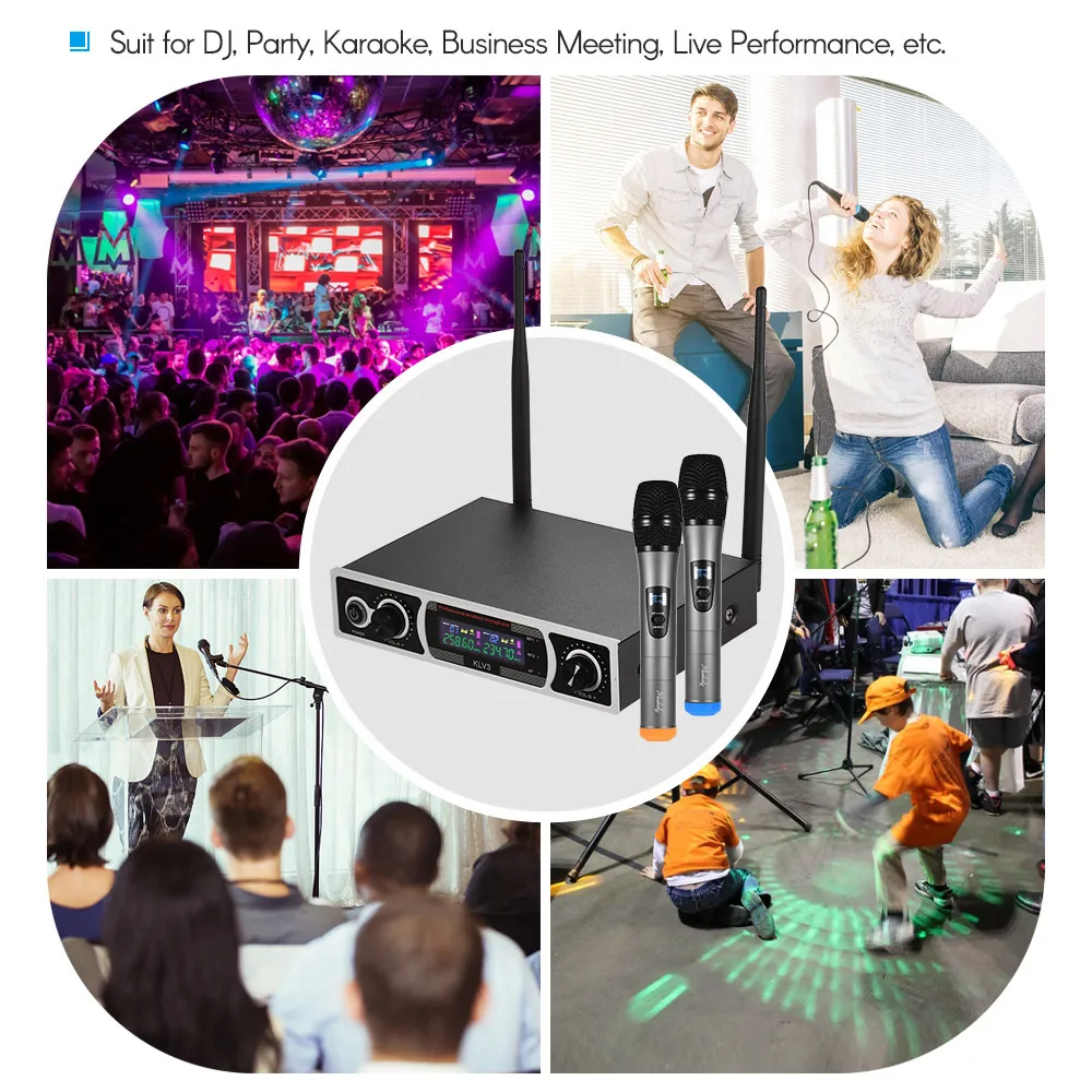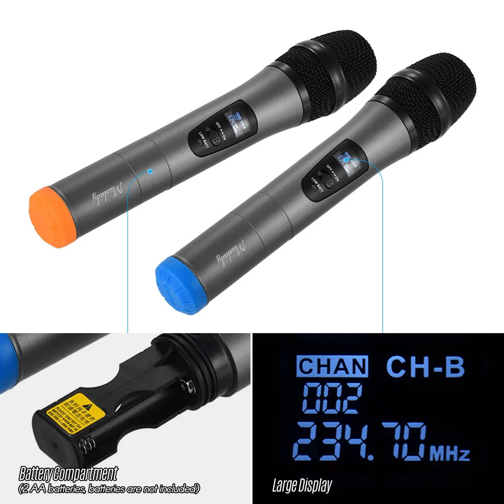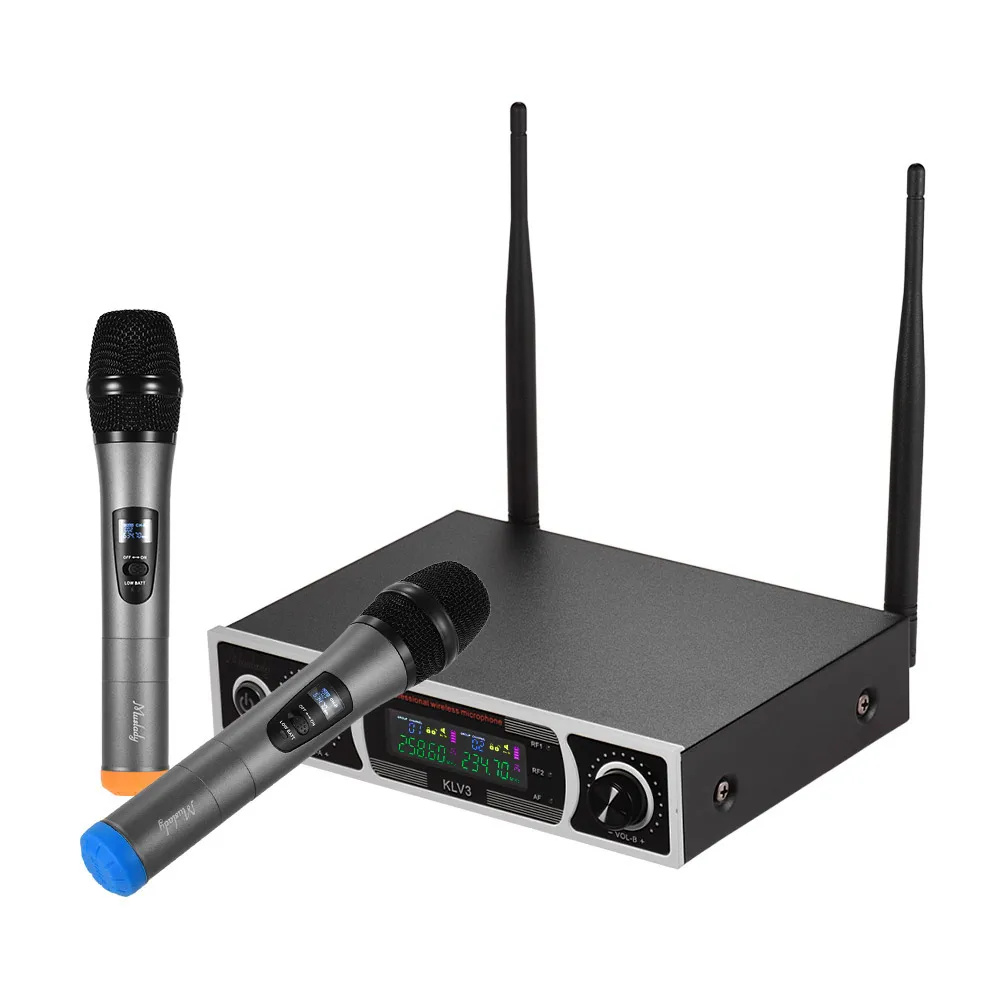 УКВ (очень высокочастотный) диапазон и двойные каналы, набор беспроводных микрофонов подходит для KTV, деловых встреч, речи и т. д.