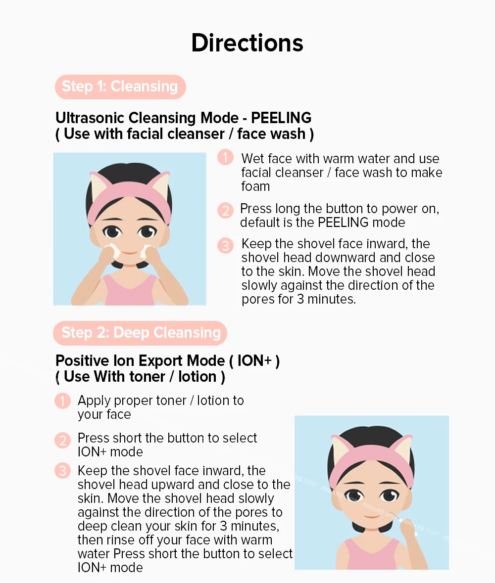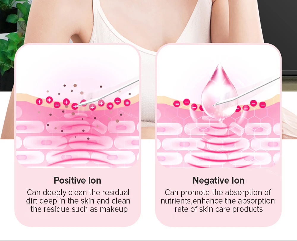 Высокочастотная Ультразвуковая вибрация + Положительный ионный экспорт, сильное удаление грязи. Ультразвуковое двухчастотное колебание + отрицательные ионы вводят, лучше поглощают эссенцию.
