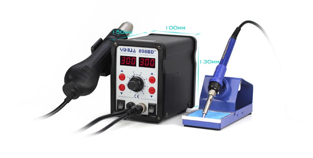 Параметры: Модель: 898BD + Входная мощность: 700 Вт Номинальное напряжение: 220 В переменного тока Входное напряжение: 110 В переменного тока Рабочая среда: 0-40 Относительная Температура: 80% Относительная влажность: 80% Среда хранения:-20-80 Уровень акустического звука: 45 дБ Размеры: 150*100*130 мм Пистолет горячего воздуха Напряжение: 220 В/110 В Потребляемая мощность: 650 Вт ± 10% Диапазон температур пистолета: 100-480 Воздушный поток: 120 л/мин (макс) Стабильность температуры: ± 1 (Статик) Материал пистолета: Ферро-сплавы Паяльник Диапазон температур: 200-480 Материал пистолета: керамический нагреватель Температура стабилитов: ± 1 (статическая)