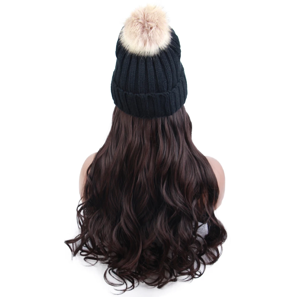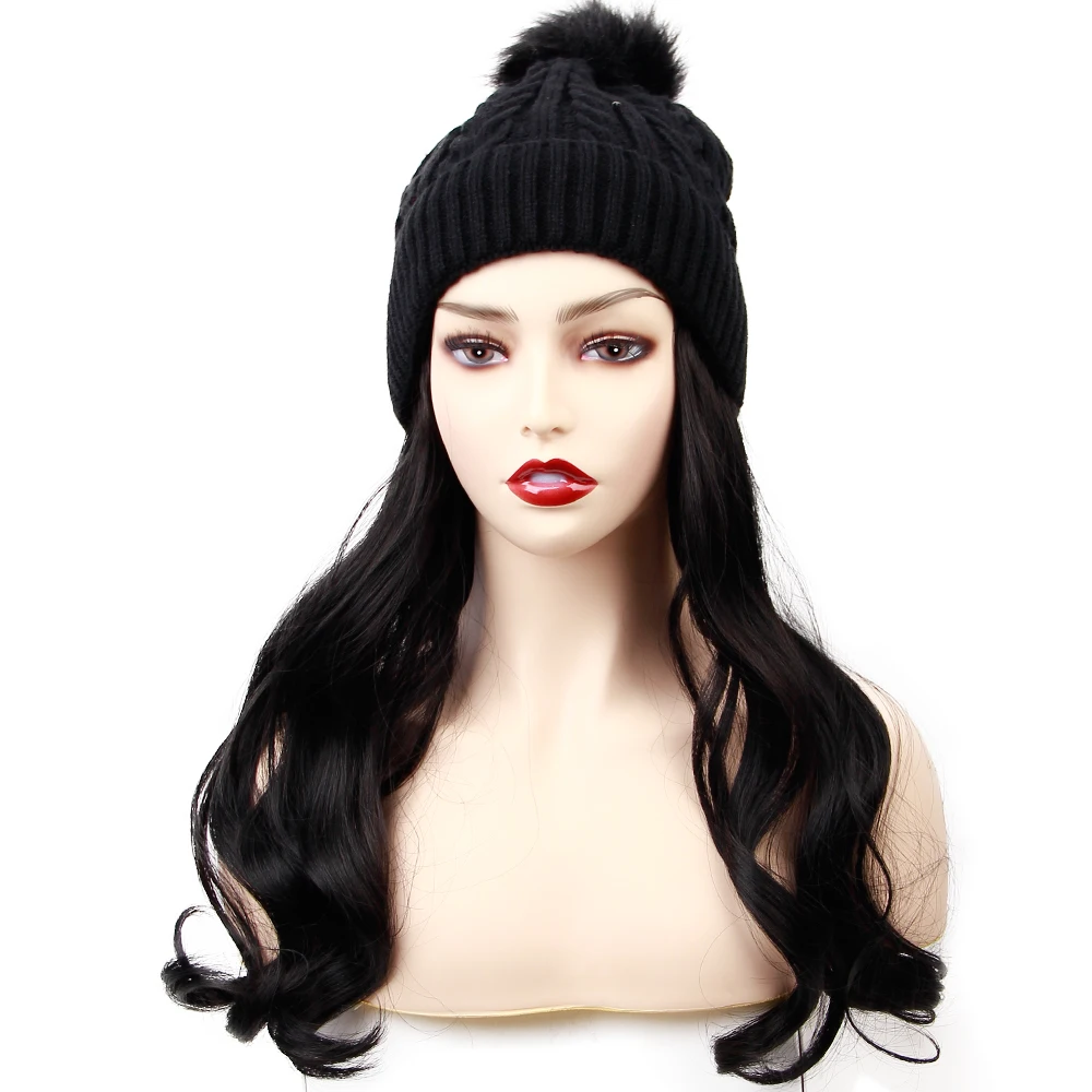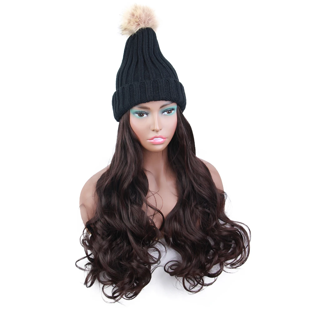 Длинный парик из синтетической шляпы, 22 дюйма, вязаная Лыжная шапка, волнистые волосы для наращивания с черной шапкой, Длинные Синтетические волосы для наращивания, интегрированная шапка с волосами для женщин, регулируемая