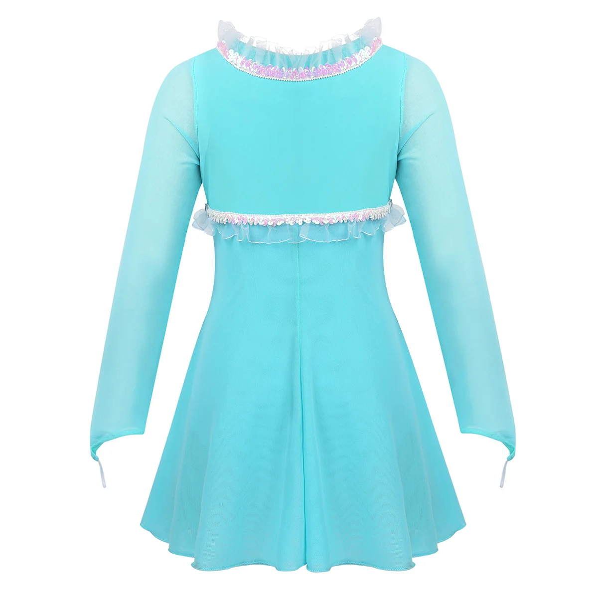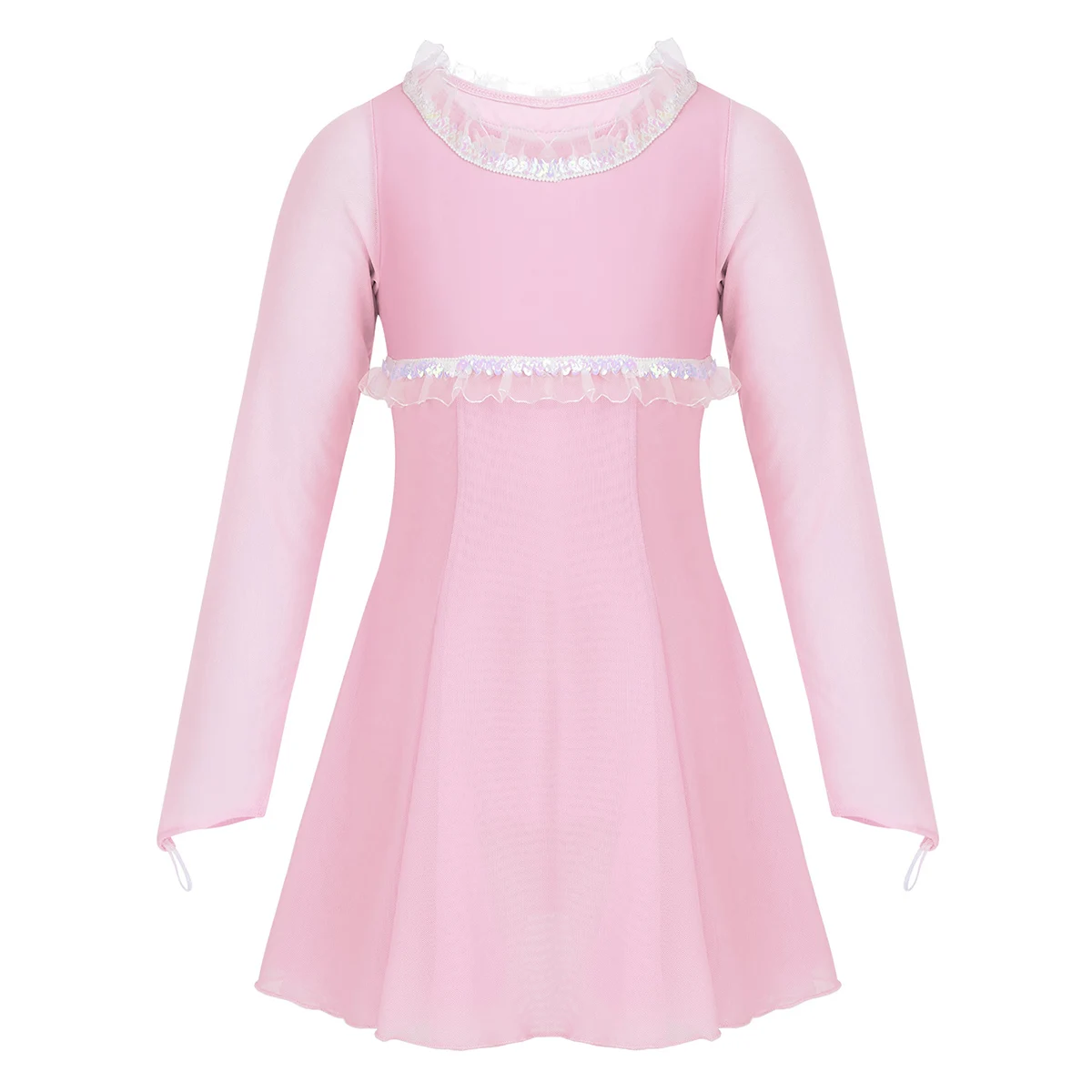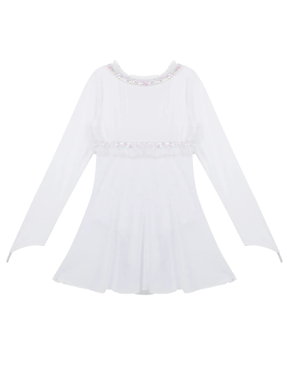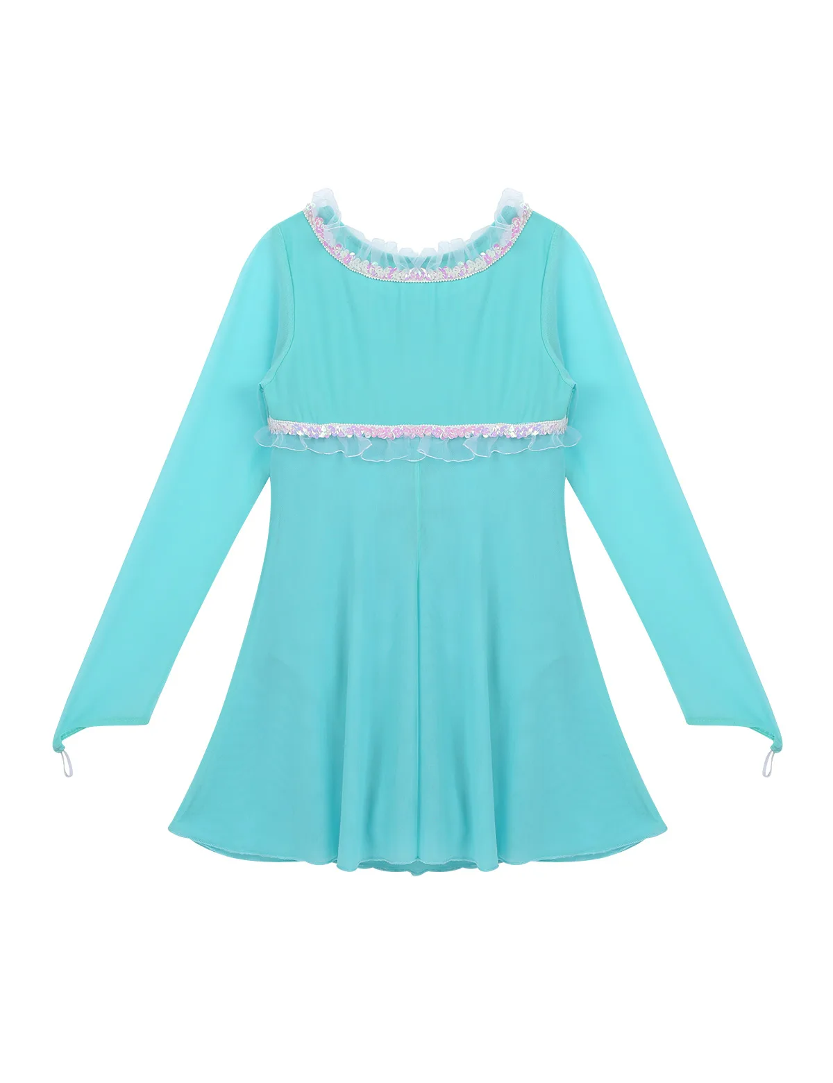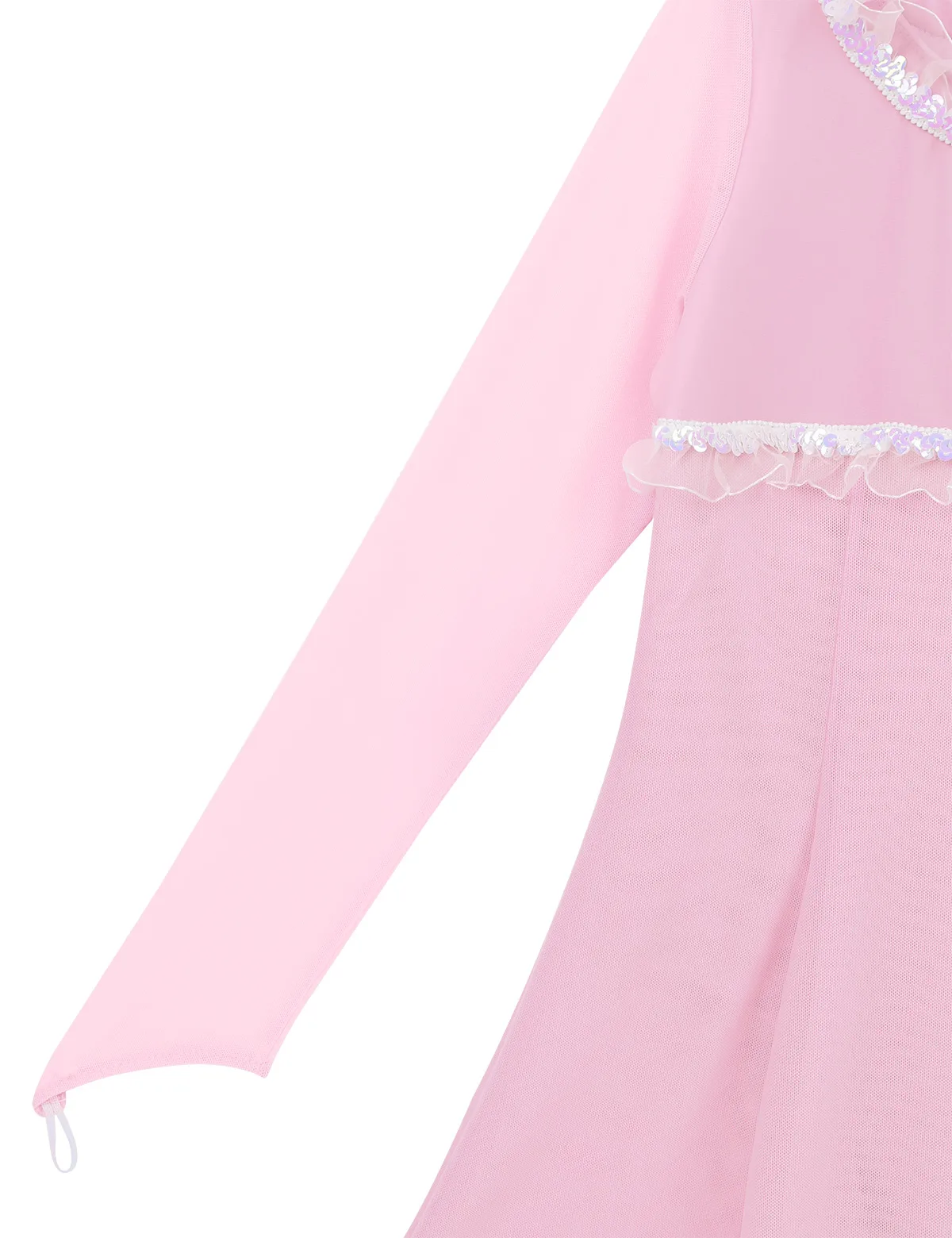 Полупрозрачные Длинные рукава с эластичной петлей для пальцев. Круглый вырез горловины и лиф украшены отделкой рюшами из пайеток.