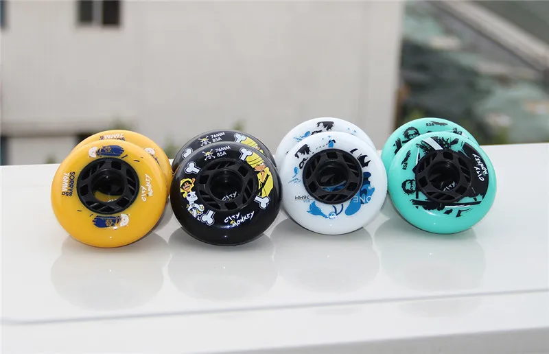 1. Черный/белый/зеленый/желтый цвета 2. 72 мм, 76 мм, 80 мм 3. Твердость 85A многофункциональное колесо для слалома и торможения катания 4. Колеса с героями мультфильмов отличного качества. 5. Высококачественный прочный полиуретановый материал 6. Хороший опыт для уличной чистки катания на коньках