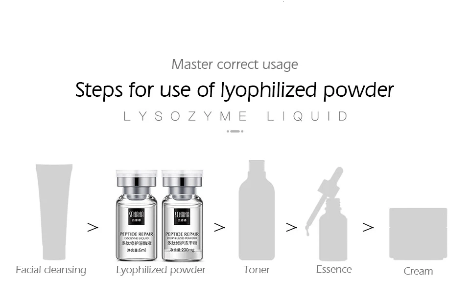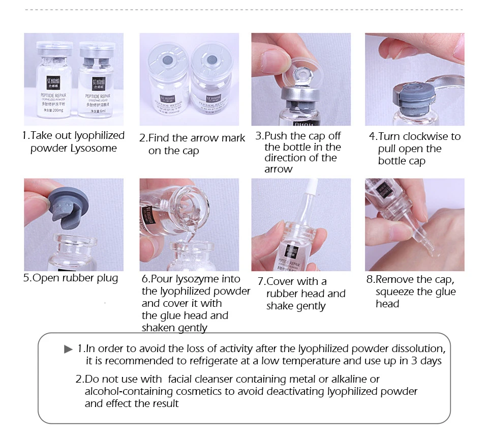 Не используйте с очищающим средством для лица, содержащим металл, щелочную или спиртосодержащую косметику, чтобы избежать деактивации лиофилизованного порошка и воздействия на результат