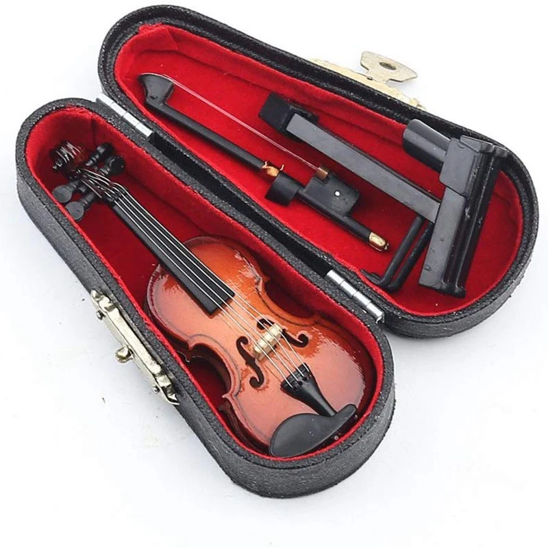 Эта высококачественная миниатюрная скрипка ручной работы полностью украшена струнами, подставкой для подбородка, мостом и деревянным корпусом.