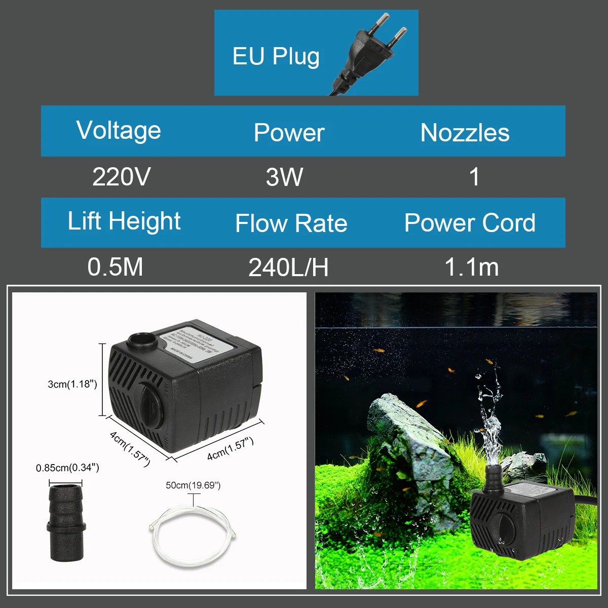 -Цвет: черный -Материал: АБС-пластик -Мощность: 3 Вт/5 Вт -Максимальный расход: 3 Вт-240 л/ч 5 Вт-400 л/ч -Напряжение: 110 В, 220 В -Частота: 50 Гц, 60 Гц -Высота подъема: 3 Вт-0,5 м/1,64 фута 5 Вт-0,65 м/2,5 фута -Длина шнура питания: 3 Вт/5 Вт-1,1 м/43,31" -1 насадка (наружный диаметр): 3 Вт: 1X 8,5 мм/0,34" -2x Насадки (наружный диаметр): 5 Вт/10 Вт/15 Вт: 1x8 мм/0,31 дюйма; 1x13 мм/0,52 дюйма
