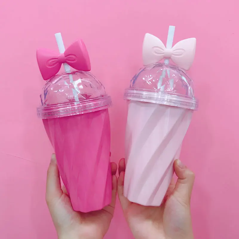 Lovely 400ML Candy Color Lemon Juice Coffee Cup Bowknot Straw Cup With Lid Straw Water Plastic Cup