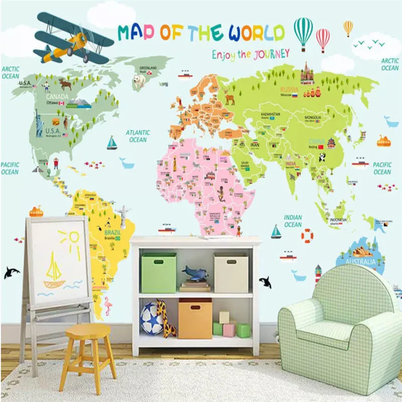 Cartoon Children's Room Background Mural Wallpaper 3D World Map Wall Papers Home Decor Three Colors Optional Papel De Parede 3D