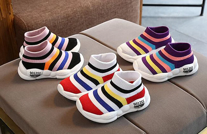 2020 теннисные туфли для маленьких мальчиков; Обувь для девочек с радугой; Flykit; Детская обувь в полоску для малышей; Chaussure Bebe; Обувь