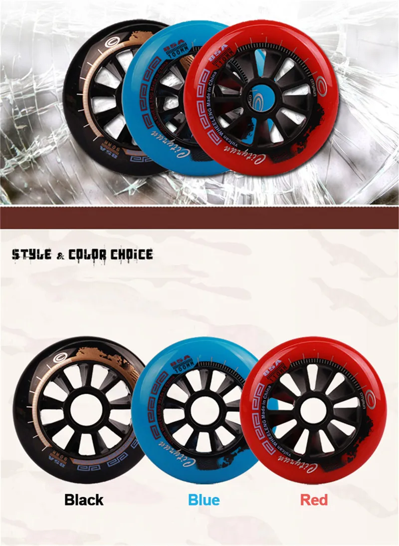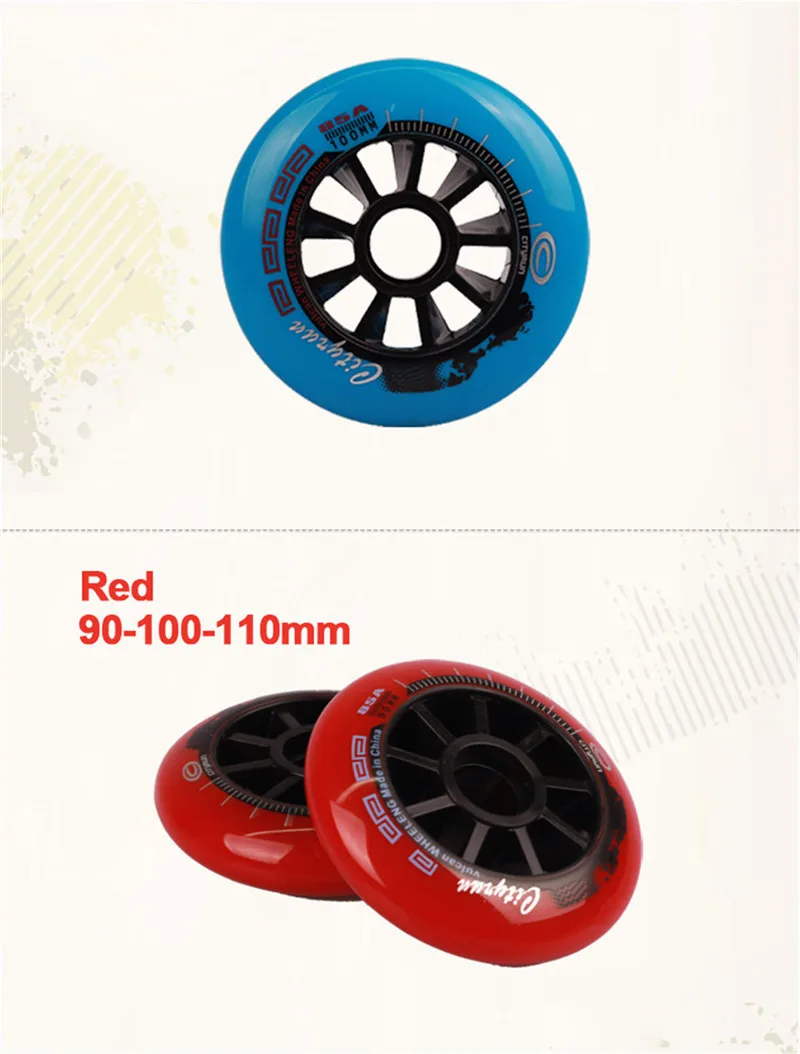 1. Цвет: черный, красный, синий 2. Размер: 110 мм, 100 мм, 90 мм 3. Твердость: 85A 3. Прочный костюм для скоростных гоночных коньков, обуви