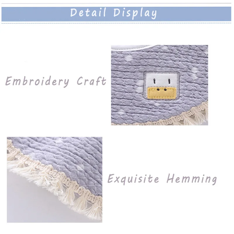 Description: 1 Cute shape, can be used as a bib or as a decoration 2 Cotton material, comfortable and skin-friendly 3 Do not chlorine bleach 4 Recommended cleaning water temperature does not exceed 30 degrees Celsius