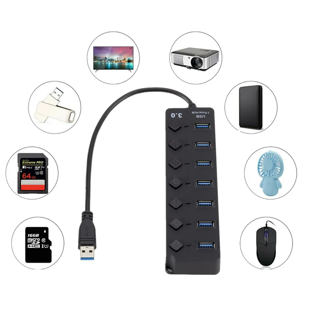 7 портов USB3.0 обеспечивает 7 сверхскоростных портов USB3.0 для передачи данных и зарядки. Он может быть использован на USB3.0 HDD, камера высокого разрешения, камера видеонаблюдения s, цифровая видеокамера s и т. д. скорость передачи USB3.0 до 5 ГБ/сек., вниз совместима с USB2.0 и USB1.1.