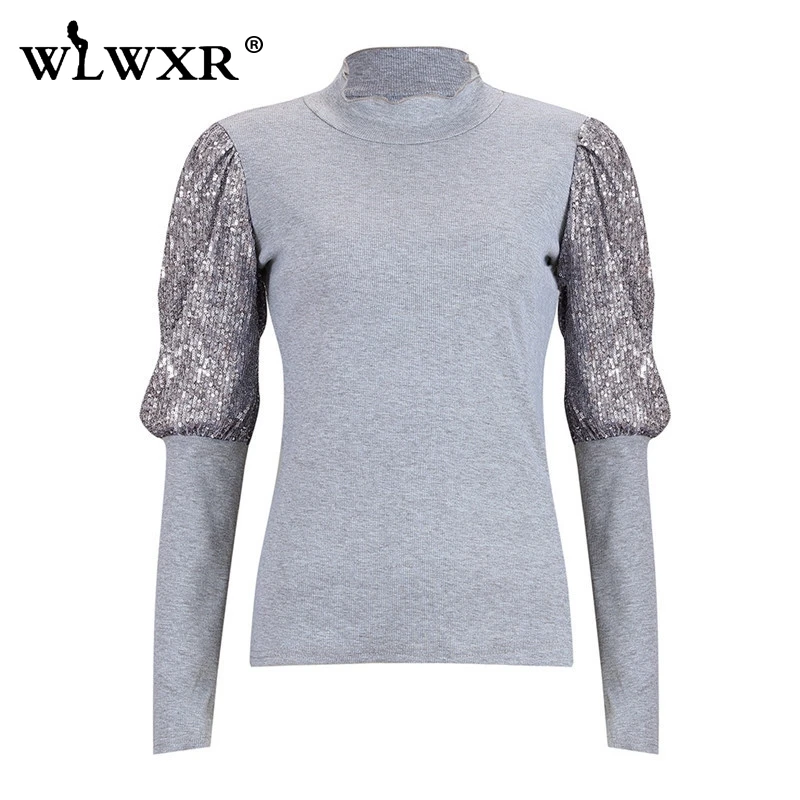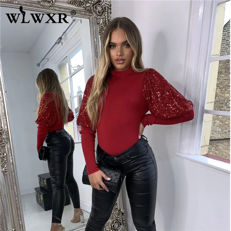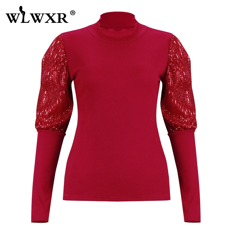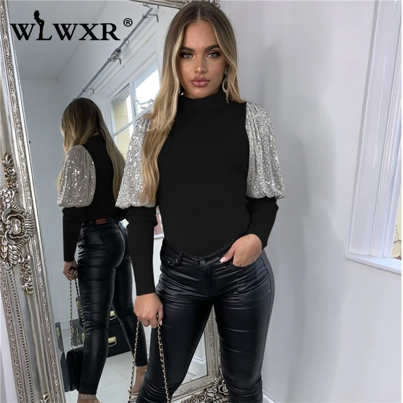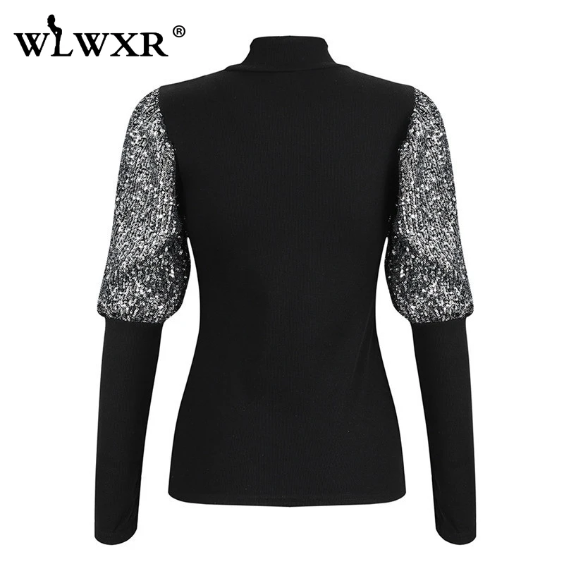 WLWXR вязаный свитер в рубчик с высоким воротом, Женский пуловер, Рождественский зимний черный свитер с сеточкой и пышными рукавами, женский джемпер, женские топы