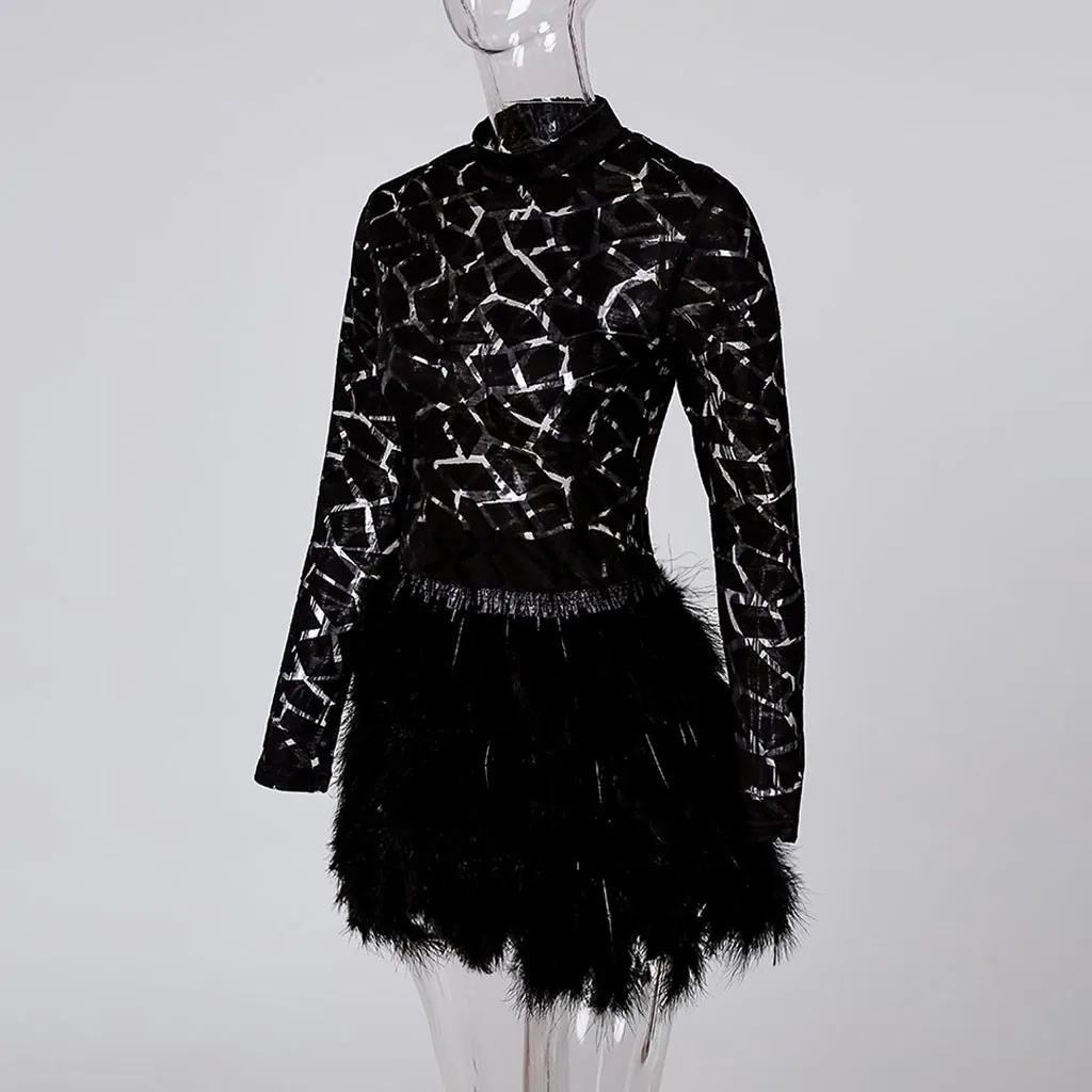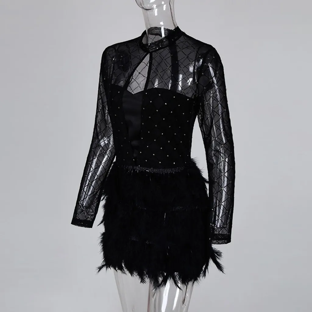Женское Сетчатое платье на молнии с плюшевой подкладкой для ночного клуба, женское платье с длинным рукавом, Сетчатое платье с искусственным пером в стиле пэчворк, Клубные вечерние мини-платья