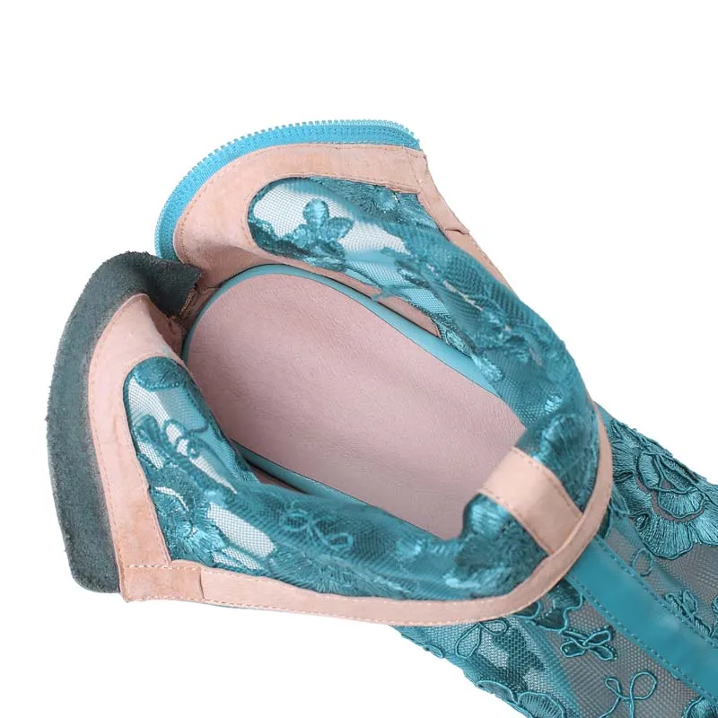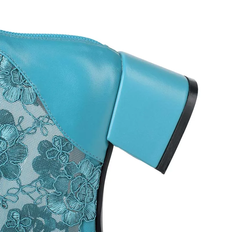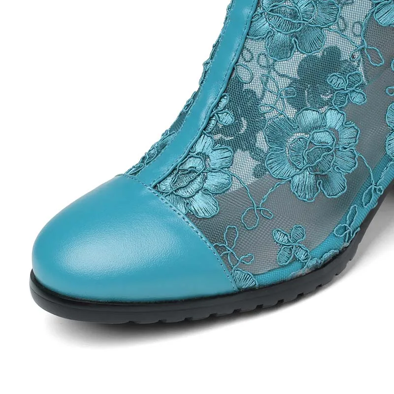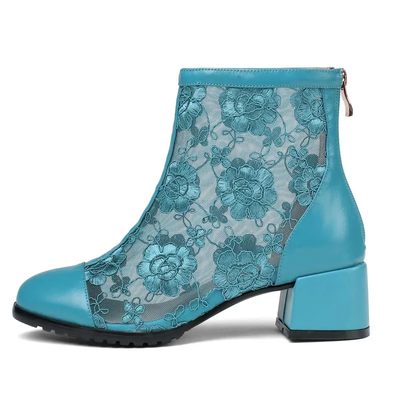 Женские летние сетчатые ботильоны из натуральной бычьей кожи, модные синие ботинки на среднем квадратном каблуке, на молнии, с круглым носком, G095