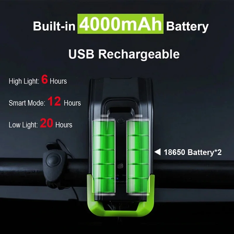Велосипедный фонарь с зарядкой от USB, умный светодиодный фонарь на руль, 4000 мАч, Передний фонарь с рожком для MTB, дорожный велосипедный фонарь