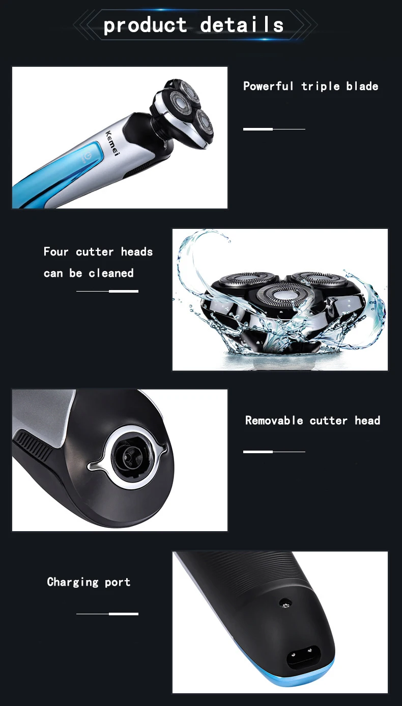 1. 4 в 1 Многофункциональный Набор для бритья, бритвенная головка, Очищающая щетка, триммер для носа, машинка для стрижки волос; 2. Маленький размер, все четыре головки резака можно мыть, И режущая головка может быть удалена и Заменить; 3. Емкость аккумулятора составляет 800 мА · ч, и она может быть Используется в течение 120 мин при полной зарядке в течение 2 часов;