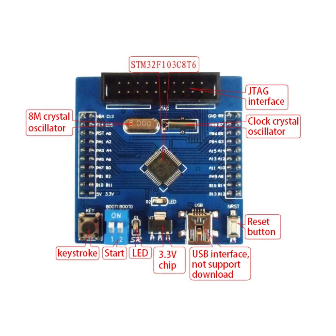 Вывод контактов: все порты IO AB, pc13 / pc14 / PC15, 1 GND, 1 3,3 V, 1 5V, 1 Vbat, 1 RST