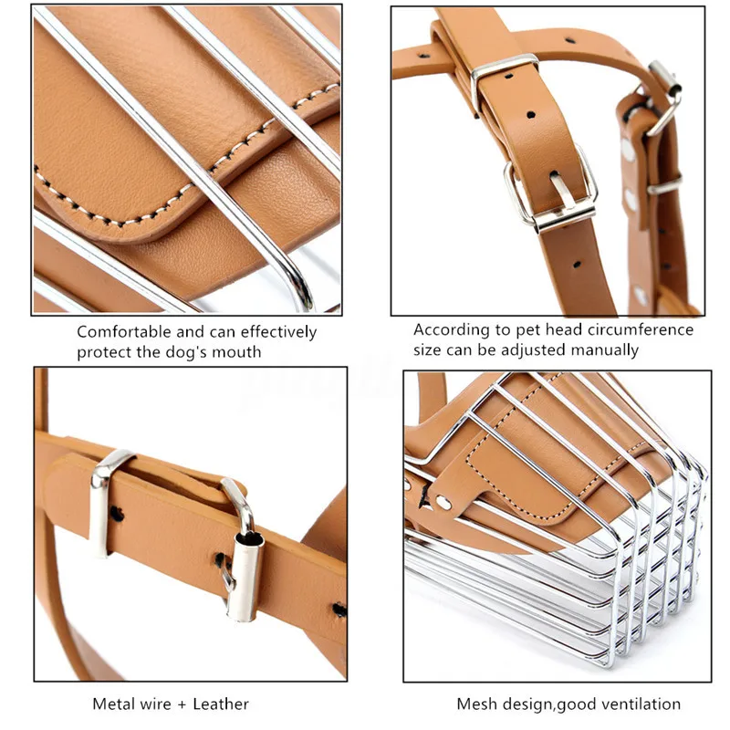 This wire basket dog muzzle can be worn while dog is walking, playing or running. This dog muzzle is made of stainless steel and leather, offering strength and durability.