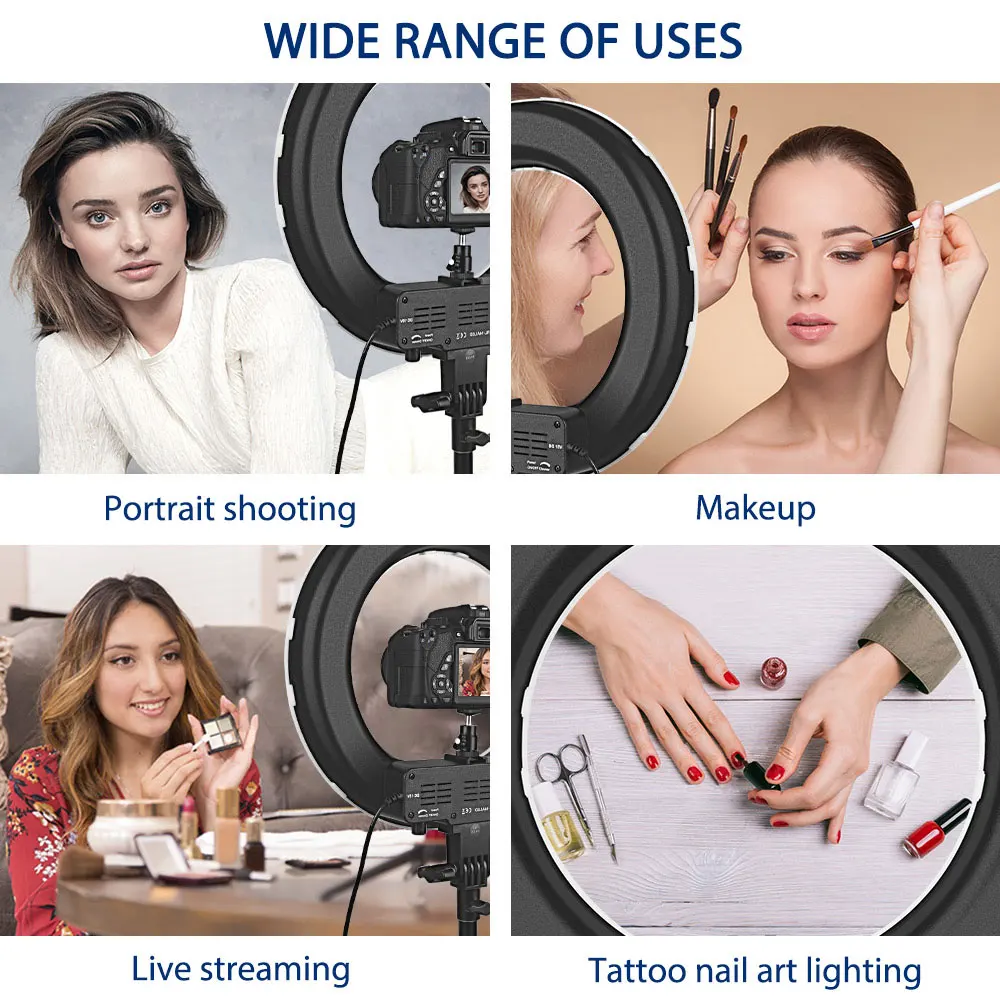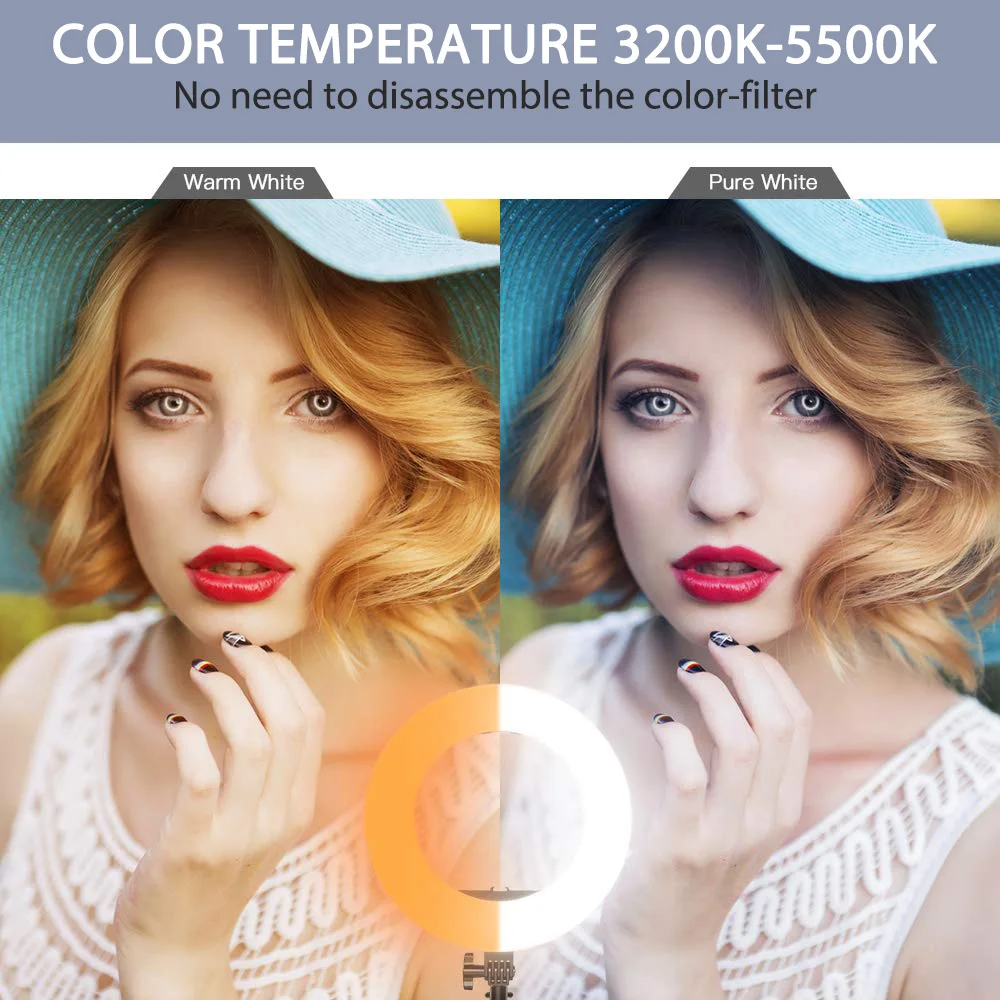 Плавная регулировка яркости: с регулируемым светом для студийных светодиодный кольцевой светильник с широкий диапазон затемнения от 10%-100%. Этот кольцевой светильник для видеозаписи обеспечивает непрерывный мягкий естественный светильник с отличной цветопередачей (CRI>90). Двухцветные 3200-5500K: Цветовая температура неограниченная, регулируемая. Кольцевой светильник для камеры может смягчить светильник, сделав фотосъемку более естественной; Свободно поворачивается: светильник стенд высота регулируется от 50 см-180 см, сделанные алюминиевый сплав с исключительной прочности. Кольцевой светильник для смартфона, работающий на 180 °, вращается свободно. Наш кольцевой светильник на YouTube идеально подходит для видеосъемки YouTube, портретной съемки, макросъемки, интервью или ENG светильник, устанавливаемый на месте или в студии; Ультра Совместимость: на фото-и видеосъемки lightning комплект поставляется с переходник внешней вспышки типа Горячий башмак для большинства камер, и держатель мобильного телефона для большинства смартфонов, таких как iPhone 7 plus/7/6 plus/6/5/5S, samsung Galaxy S6 Edge/S6/S5 и т. Д. (камера и смартфон на картинке не включены)