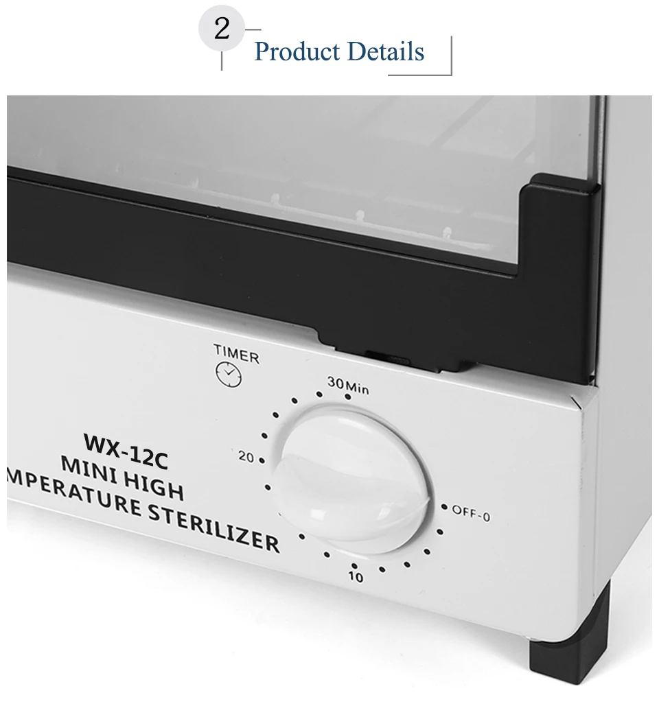 Тип: Профессиональный высокотемпературный стерилизатор Номер модели: WX-12C Напряжение: 220 V-240 V/50-60Hz продукция G.W: 4500g Сертификат: CE Страна происхождения: Гуанчжоу, Китай Номинальная мощность: 1000 Вт Емкость: 12 л Цвет: белый размер изделия: 32,5*22,5*21 см Температура стерилизации: 100-250 ℃ Время дезинфекции: ≥30min Функция: шкаф для дезинфекции инструментов для ногтей