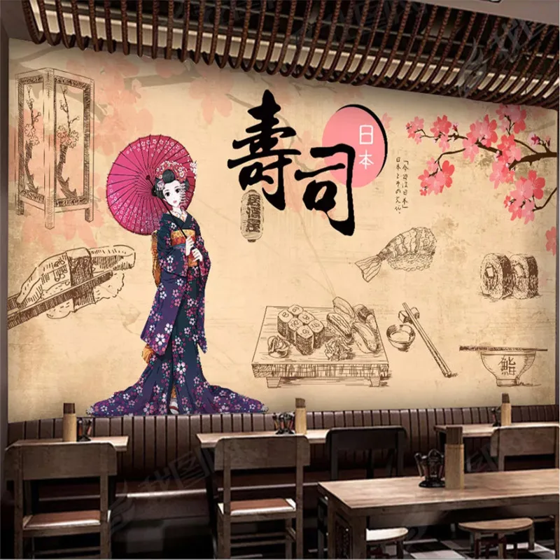 Ручная роспись Япония Знаменитые Достопримечательности настенная бумага 3D кимоно красота японская кухня суши Ресторан промышленный Декор настенная бумага