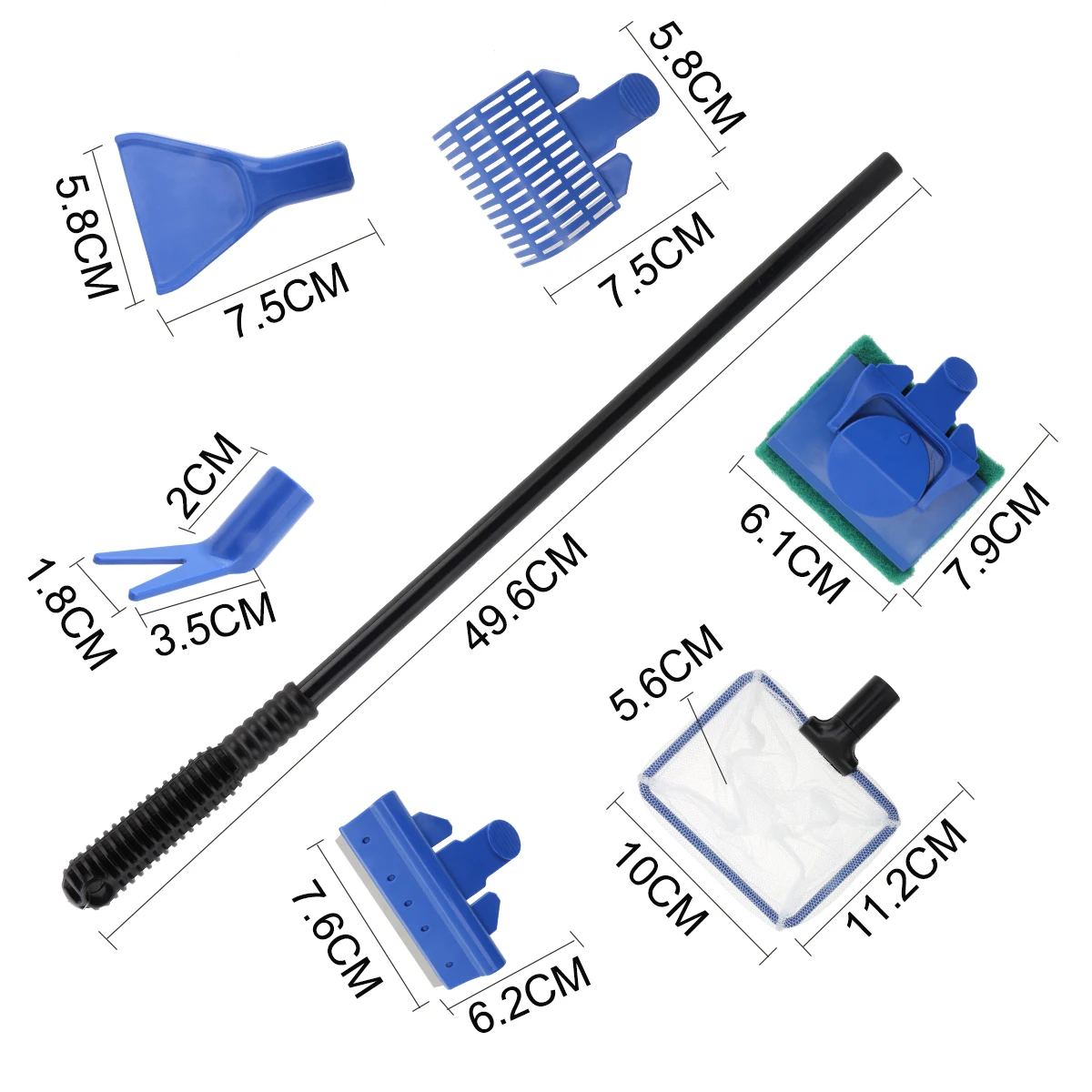 -Общая длина: Длина стержня (включая ручку): 49,6 см/(19,5 ") Вилка для растений (Д * Ш * В): 3,5*1,8*2 см/(1,4 ”* 0,7” * 0,79 ”) Ложка (Д * Ш * В): 11,2*10*5,6 см/(4,4 "* 3,9" * 2,2 ") Длина включает держатель аксессуаров: Гравия Грабли (Д * Ш): 11,7*5,8 см/(4,6 "* 2,3") Чистящая губка (Д * Ш): 7,9*6,1 см/(3,1 ”* 2,4”) Скребок для водорослей (Д * Ш): 8,6*7,1 см/(3,4 "* 2,8")