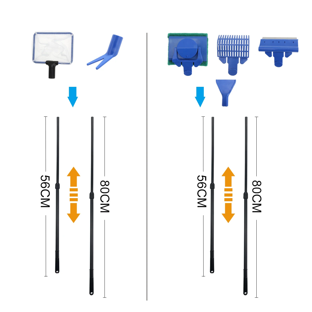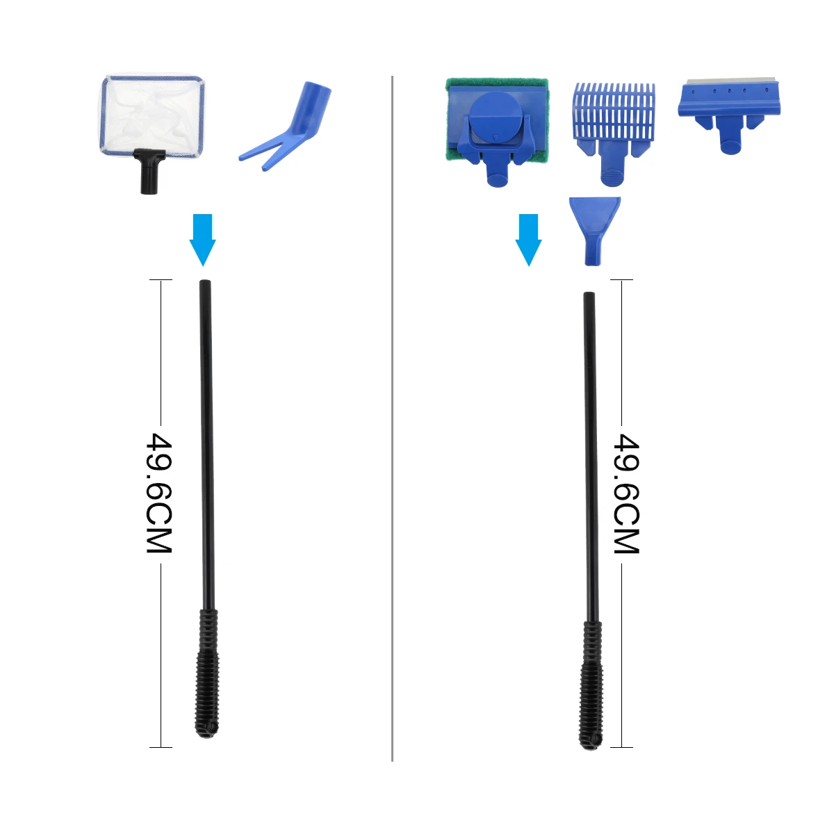 -При сборке гравия грабли, губка для очистки и скребок для водорослей должны быть оснащены держателем аксессуаров, а затем собрать к стержню. Ложка и вилка для растений могут напрямую соединиться с ней. -В случае, мы предоставляем 1 резиновое буферное кольцо, установленное в телескопической штанге для использования. (Использование как показано)
