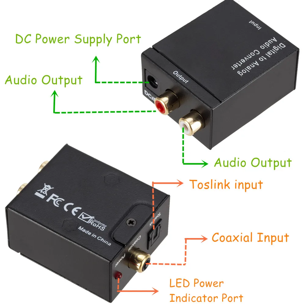 Особенности: Преобразует коаксиальные или Toslink цифровые аудио сигналы в аналоговый L/R аудио Поддерживает частоту дискретизации 32, 44,1, 48 и 96 кГц. 24-бит S/PDIF входящий бит потока на левые и правые каналы Обеспечивает электромагнитную передачу без шума. Простота установки и простота в эксплуатации. Питание от USB порта. Предназначен для домашнего или профессионального переключения звука. Примечание: этот элемент не преобразует Dolby. Спецификация: Входное аудио: коаксиальный или Toslink цифровой аудио Выход Аудио: аналоговый L/R аудио Вход аудио разъем Toslink, 1XRCA (коаксиальный) Выход аудио разъем: 2XRCA, оборот в минуту (R/L) Частота дискретизации: 32, 44,1, 48 и 96 кГц Рабочая температура: 0 ~ 70 °C Рабочая влажность: 10% ~ 85% относительной влажности (без конденсации) Внешний источник питания: 5 В постоянного тока/1 А Мощность Потребляемая мощность: 0,5 W Посылка включает в себя: 1 х цифровой в аналоговый аудио конвертер адаптер